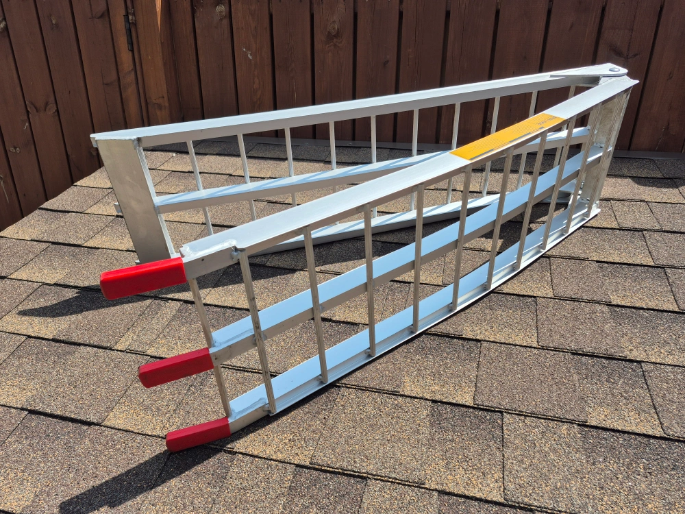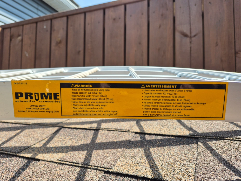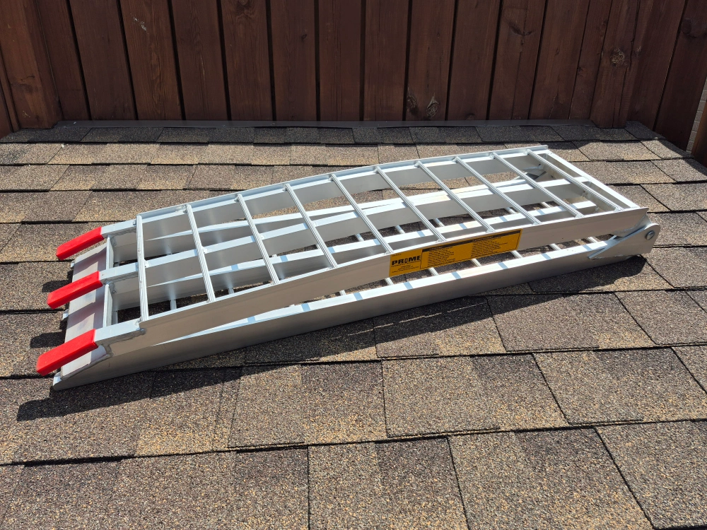 PRIME Automotive Accessories ramp. Lightweight aluminum, folding, in great condition. Key specs: - Rated capacity: 500 lb (227 kg) - Maximum tire width: 12 inch (30 cm) - Max recommended height: 30 inch (76 cm)