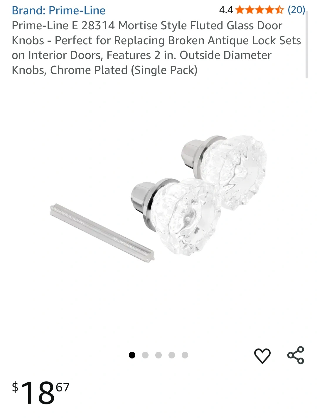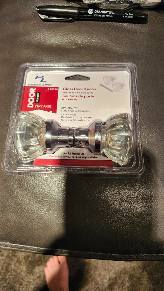 I'm selling a new set of Prime-Line E 28314 glass door knobs, still sealed in the original packaging! These vintage-style knobs are perfect for adding a touch of elegance to your interior doors. They feature a fluted design and a chrome-plated finish. The outside diameter of the knobs is 2 inches. I bought this for $18.67