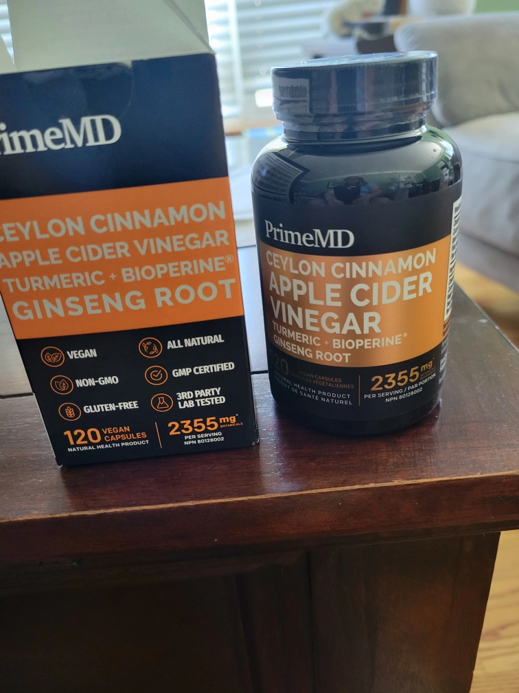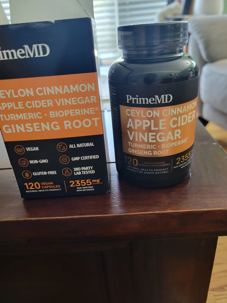 I'm selling a bottle of PrimeMD Ceylon Cinnamon Apple Cider Vinegar capsules. It contains turmeric, bioperine, and ginseng root. It has 120 vegan capsules, and 2355mg per serving. The expiration date is 2027 March 31Pick up Lower Stoney Creek