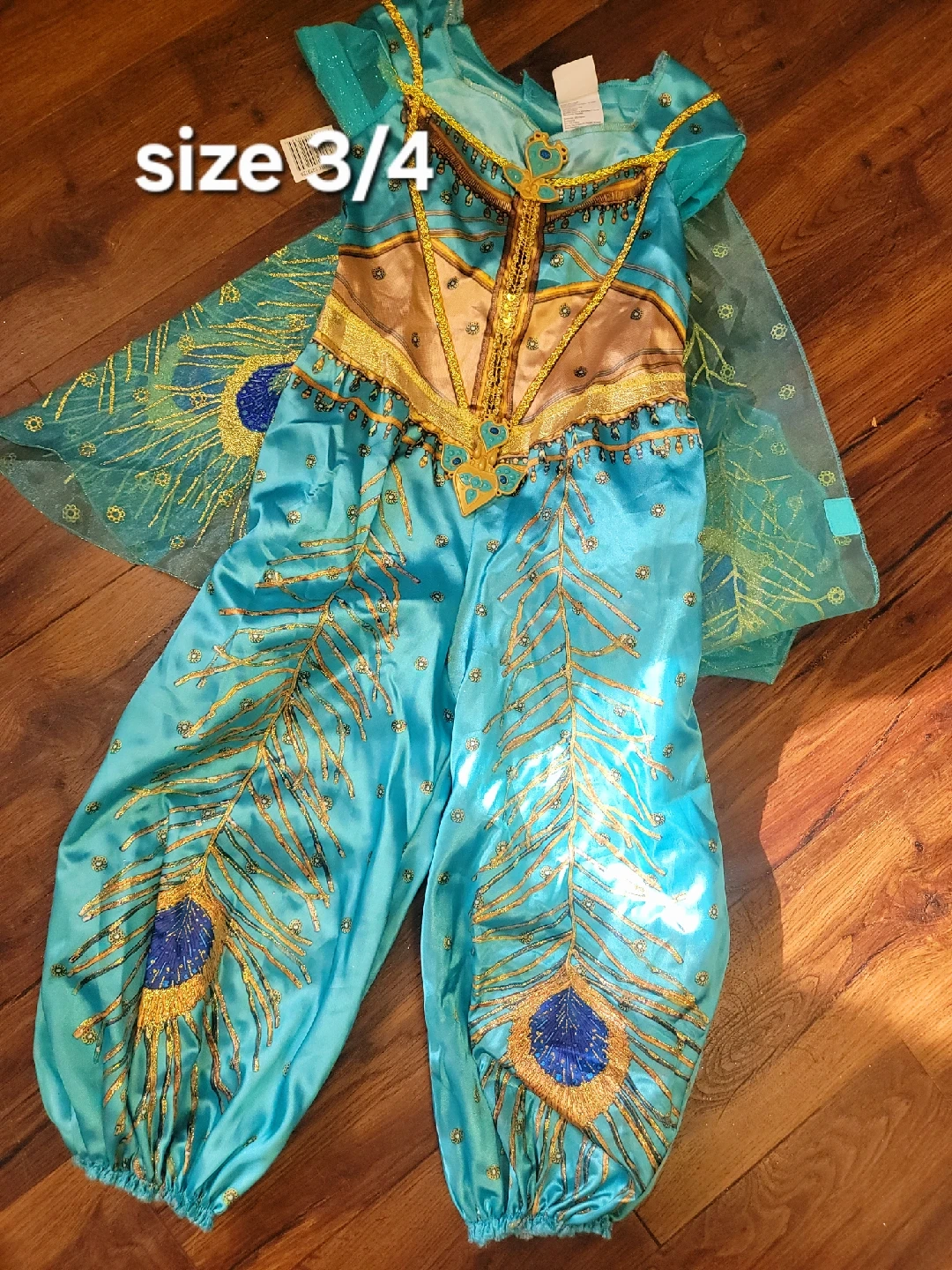 36Selling a super cute Jasmine costume in size 3/4! It's in great condition and features beautiful peacock feather detailing. Perfect for dress-up or Halloween!