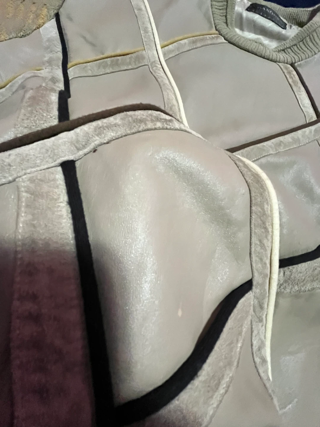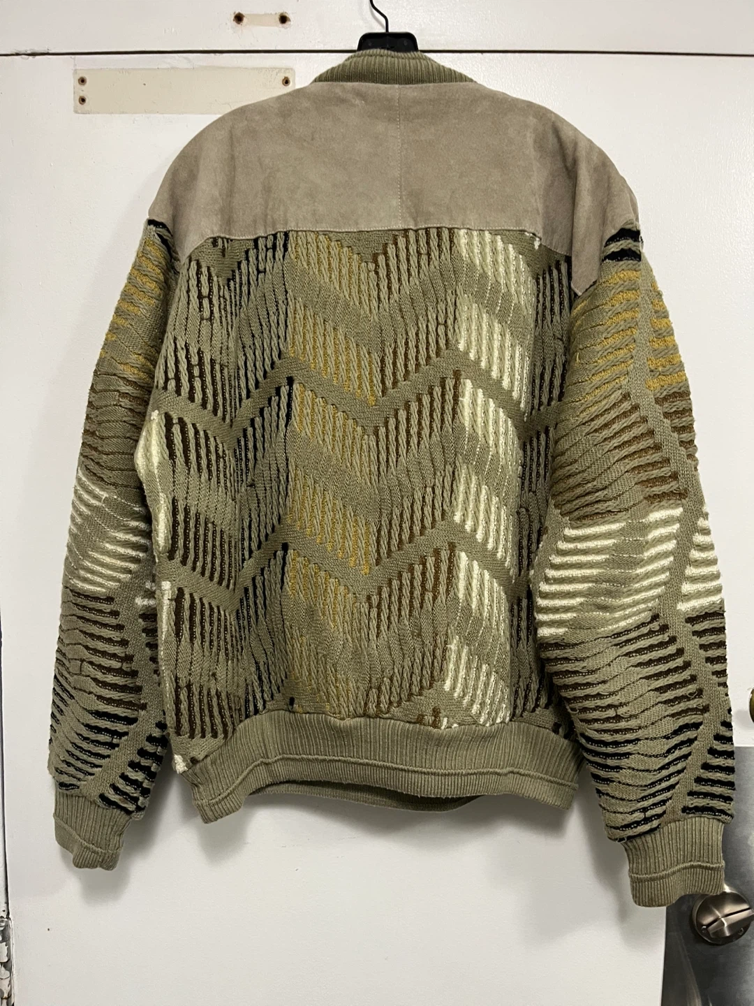 This Saxony Collection sweater features a unique patchwork design with genuine leather panels and intricate knit sleeves and back. It's made from 92% acrylic, 8% nylon with a 100% polyester lining. Size medium.inside is lined at the front