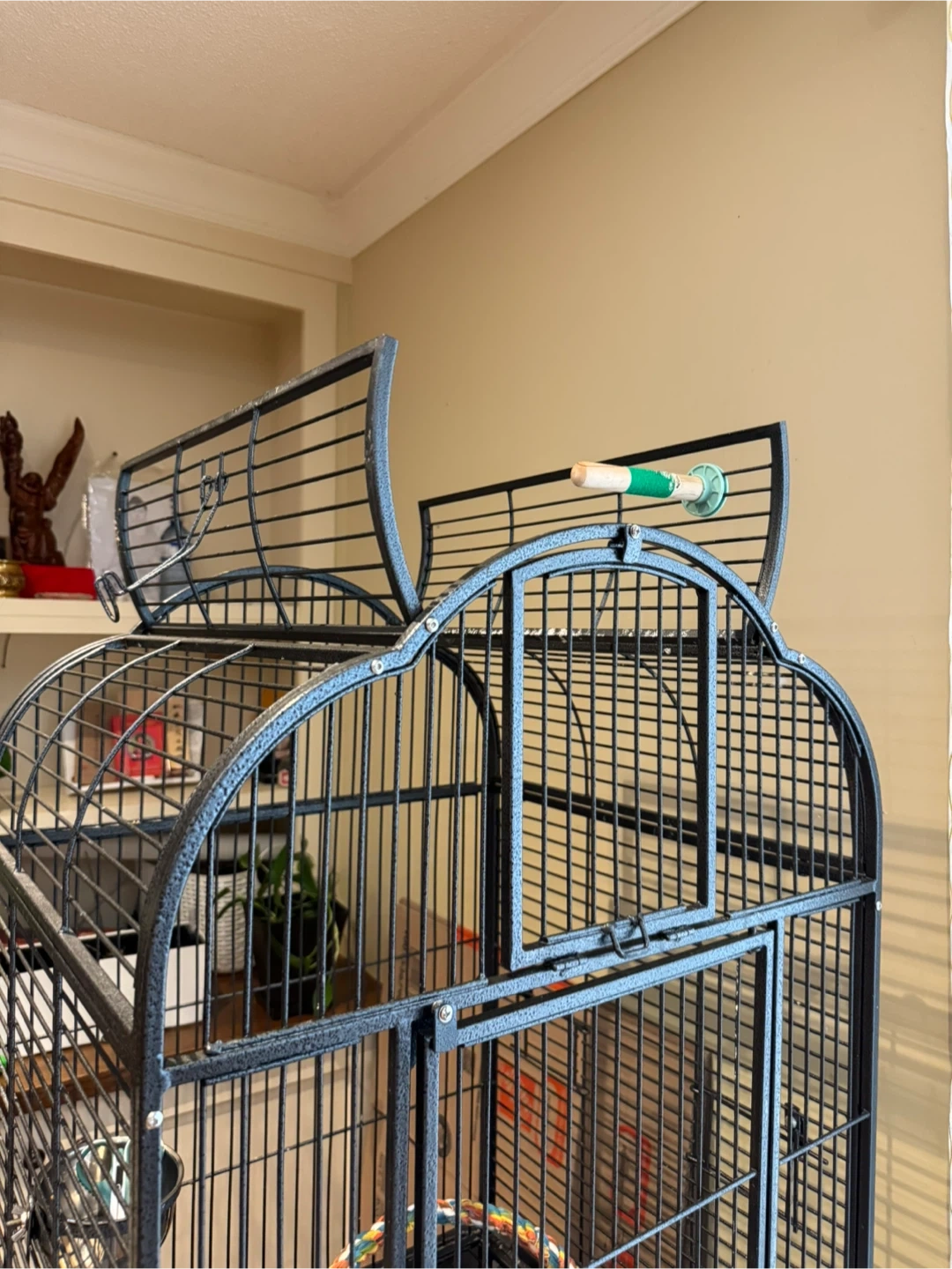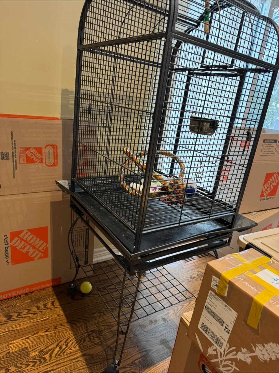 This is a large, black metal bird cage, comes with a stand and a perch inside. It's suitable for various bird sizes. The cage features multiple doors and a pull-out tray for easy cleaning. It also includes a colourful rope toy. 150 cm H, 60 cm W, 60 cm L