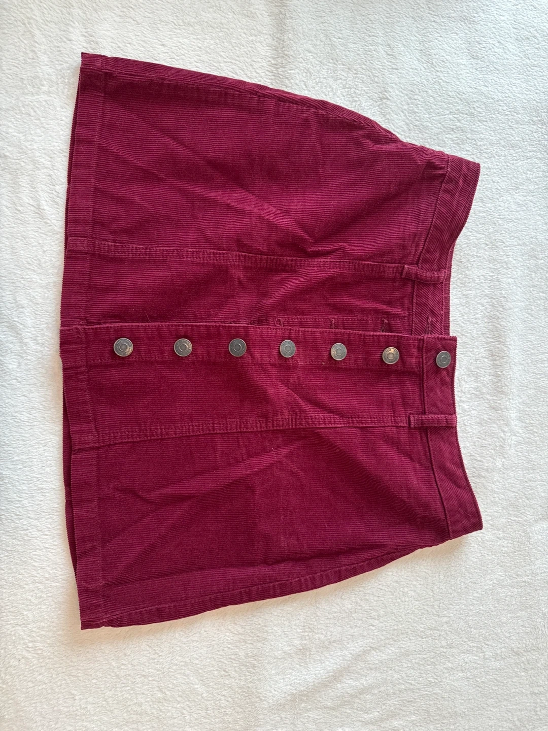 Burgundy corduroy skirt with a button-front closure. It's made of soft corduroy material. This skirt is great for cooler weather outings!