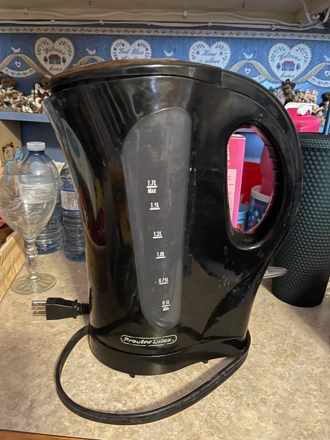 Black electric kettle. Cord included. Water level markings visible. Used. Needs a descaling.