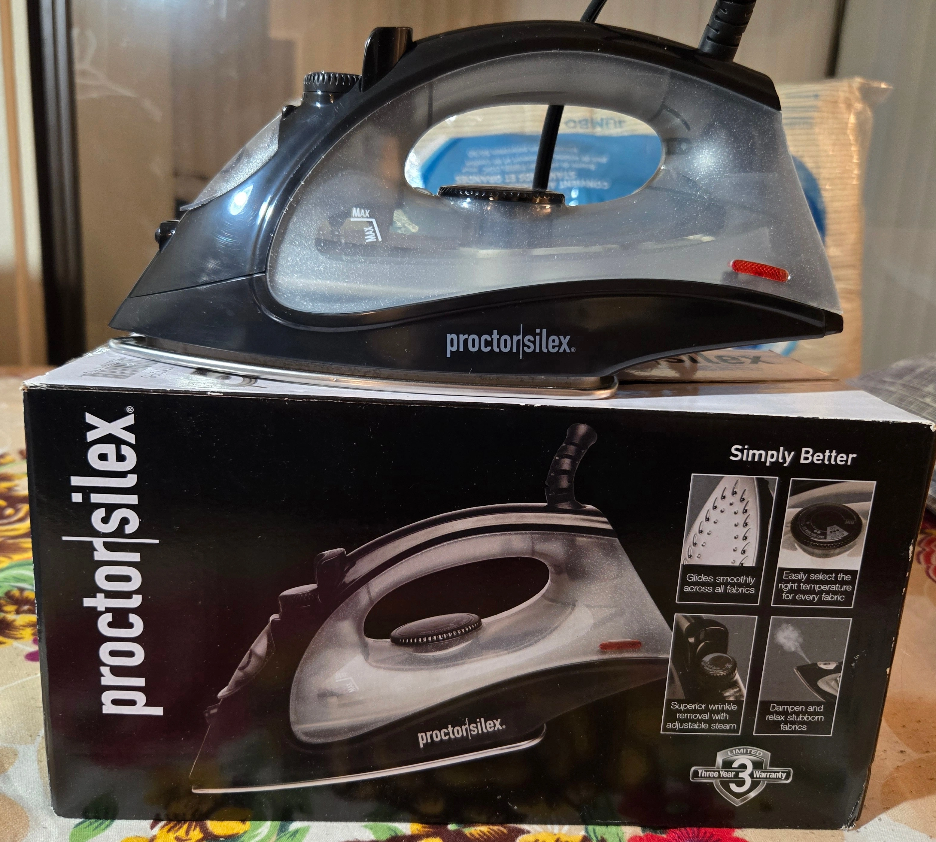 Proctor Silex Iron with Stainless Steel Soleplate 17172PS, Stainless Steel Soleplate Easy To Use Stainless Steel soleplate Self clean system Burst of steam Vertical steaming Adjustable steam Fine-mist spray. Full view water window Item link: https://www.walmart.ca/en/ip/Proctor-Silex-Iron-with-Stainless-Steel-Soleplate-17172PS/6000196038686?selectedSellerId=0&wl13=3135&cmpid=SEM_CA_48645_6UXQW0HOXV&utm_id=SEM_CA_48645_6UXQW0HOXV&utm_medium=paid_search&utm_source=google&utm_campaign=always_on&gclsrc=aw.ds&gad_source=1&gad_campaignid=21810124752&gbraid=0AAAAADv6L0RQibJy_DF9r2kOKn6VoZMV1&gclid=Cj0KCQjwrojHBhDdARIsAJdEJ_ecXE8n2CS6Vk0sWHMb8ZrRvyG8Z4svLSj4AWd2WENQ0xi9oLzsBQAaAlMyEALw_wcB