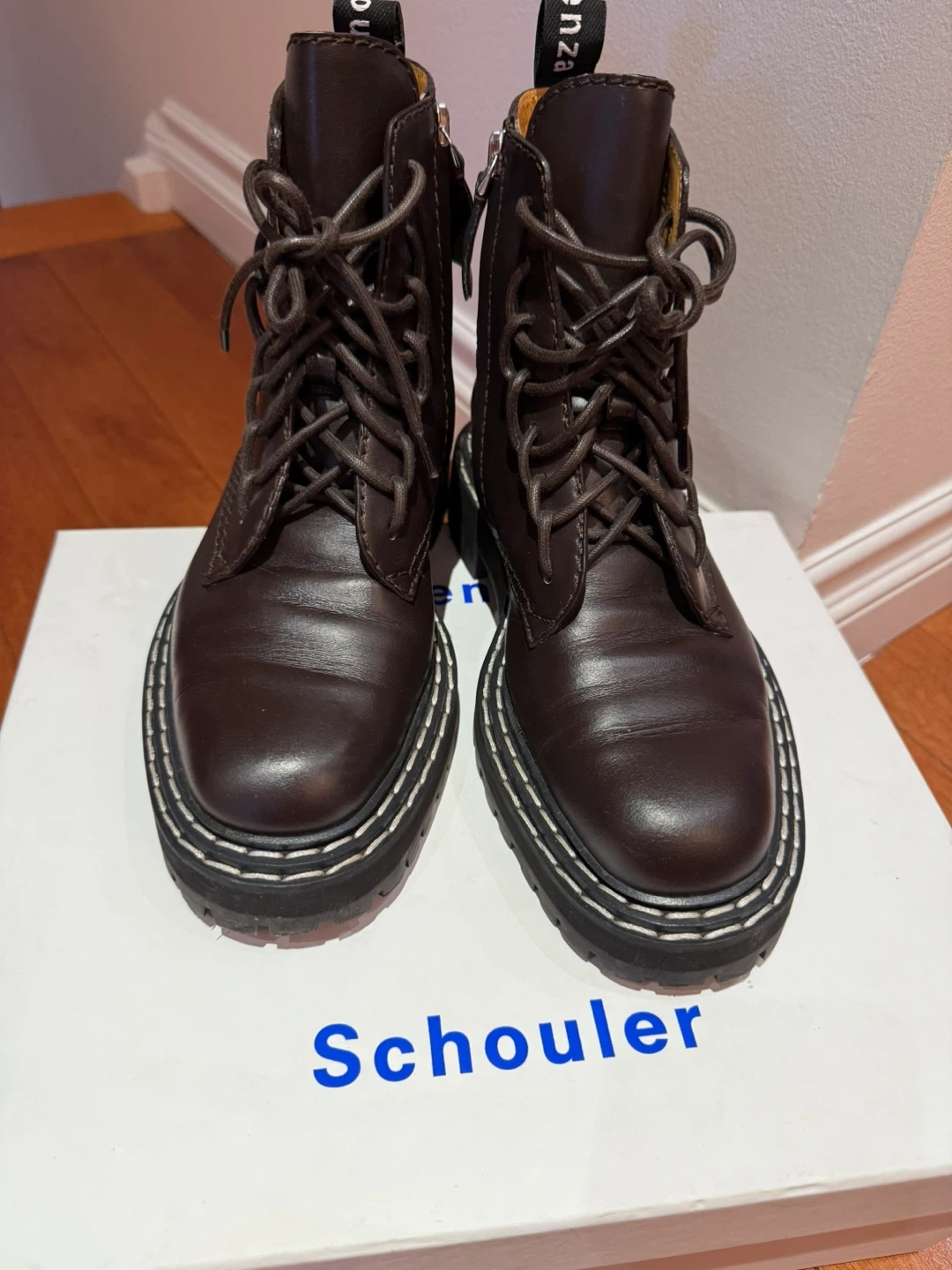 Selling a pair of Proenza Schouler ankle boots in a rich brown leather! They're a size 37. 6US size, for narrow fit.The boots feature a lug sole and lace-up design. Comes with the original box! Worn just a few times.