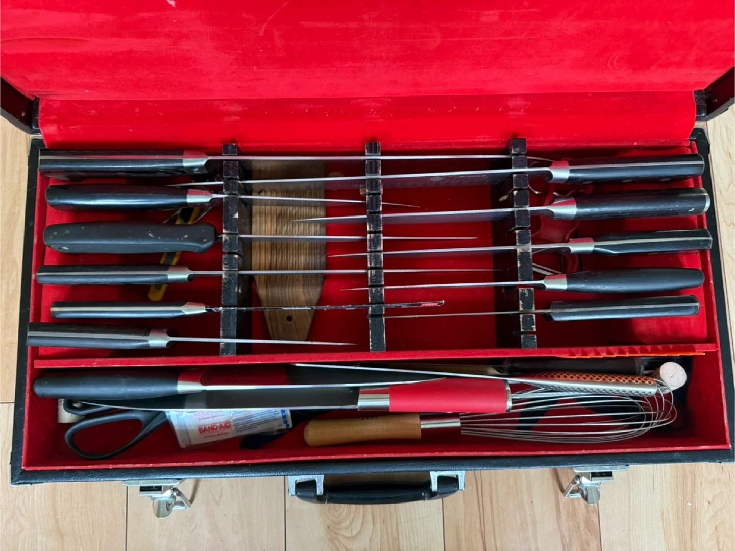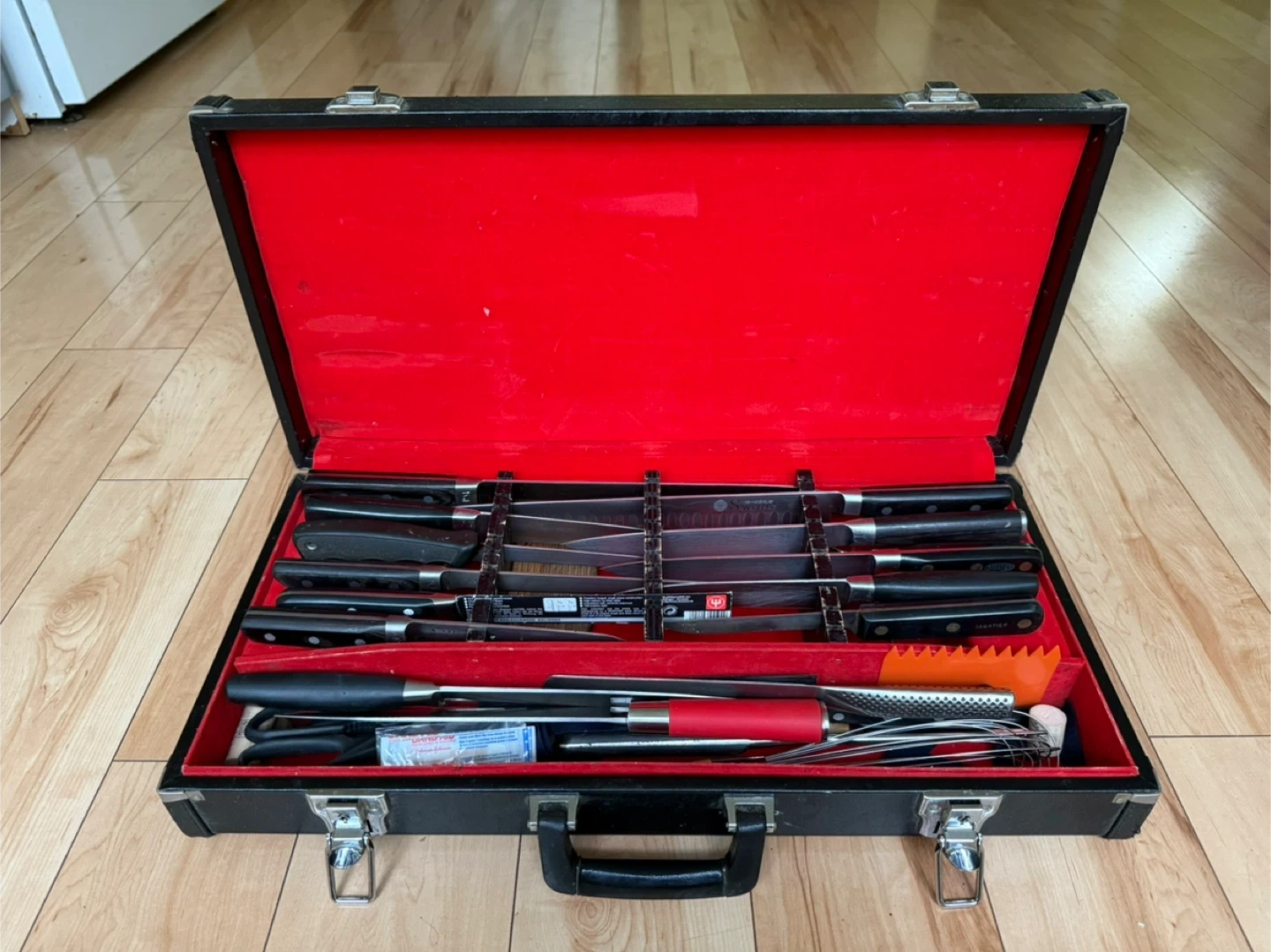 Selling a knife kit including S-3 knife set, complete with a variety of curated knives and tools inside a Japanese-made carrying case. The set includes various sizes and brands that served a 25 year career. Great for any serious chef. Featured in a New York Times Magazine article.