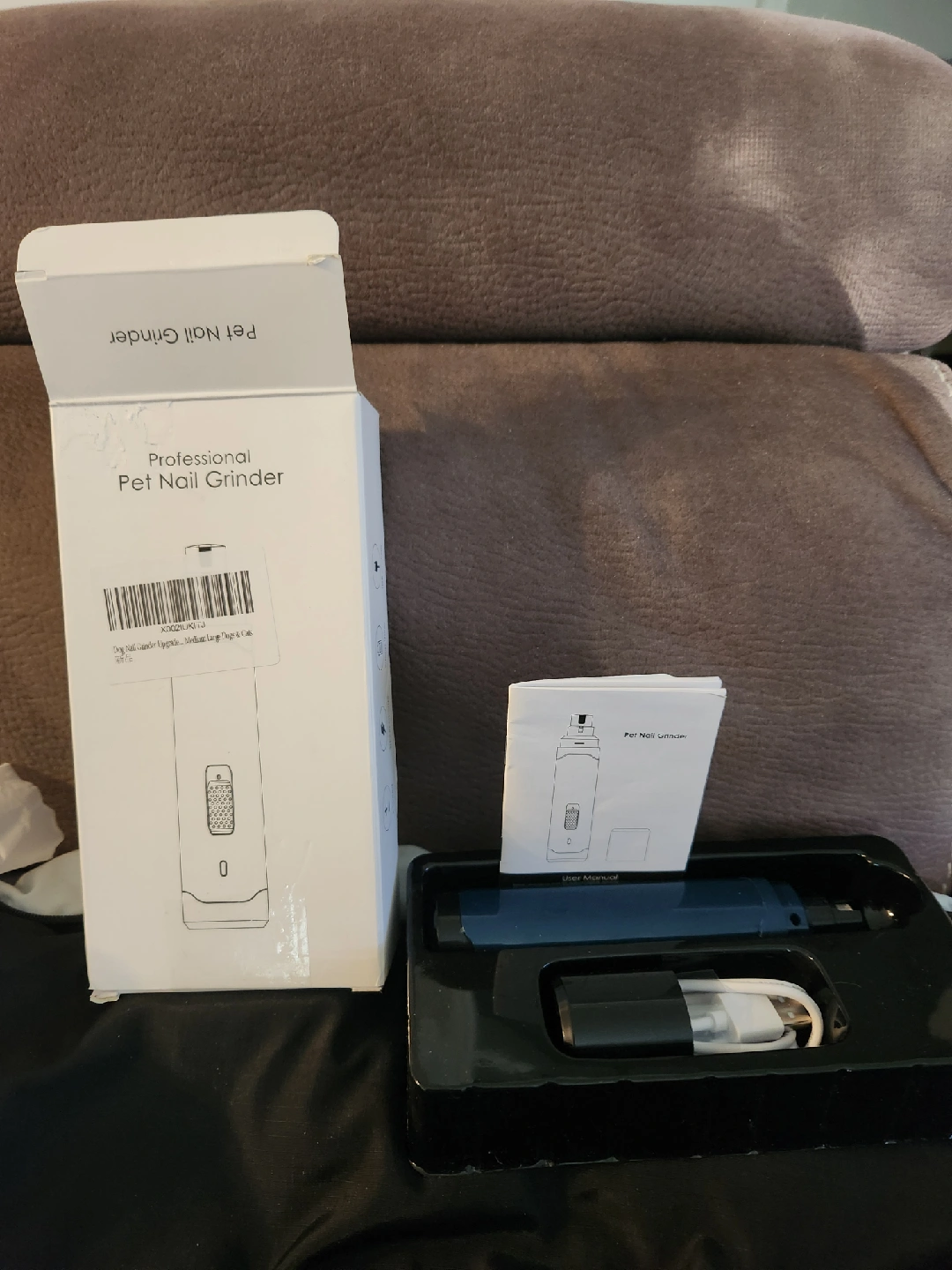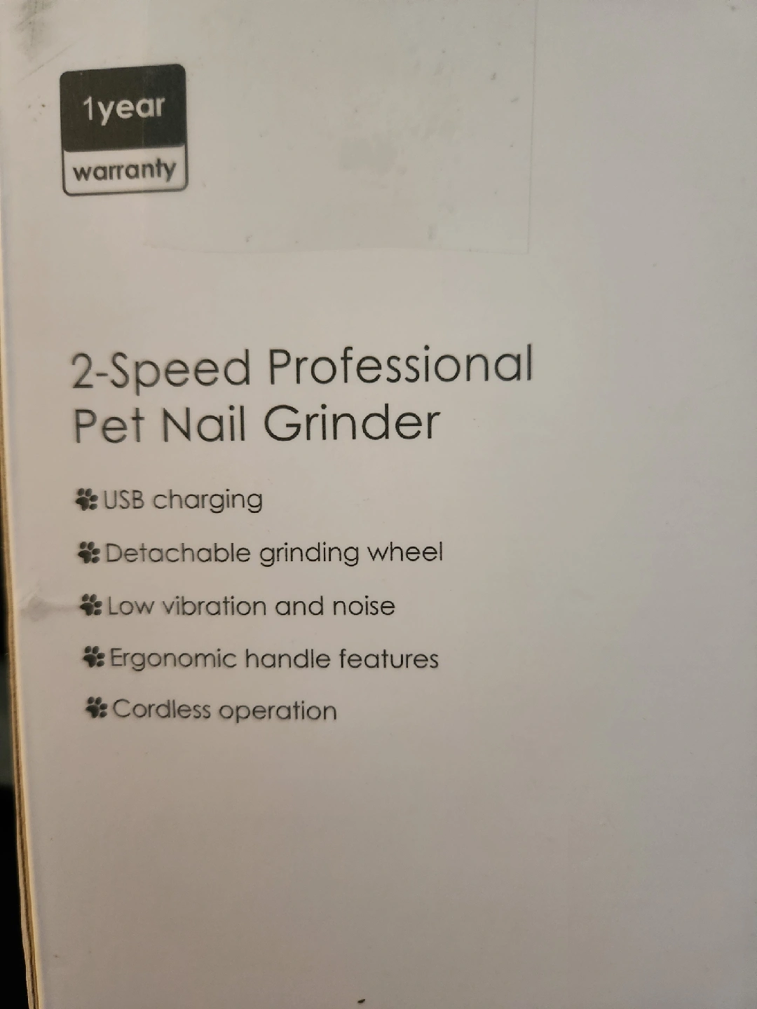I'm selling a brand new professional pet nail grinder! It's still in its original box and includes all components, such as the USB charging cable and user manual. It features: - USB charging - Detachable grinding wheel - Low vibration and noise - Ergonomic handle - Cordless operation
