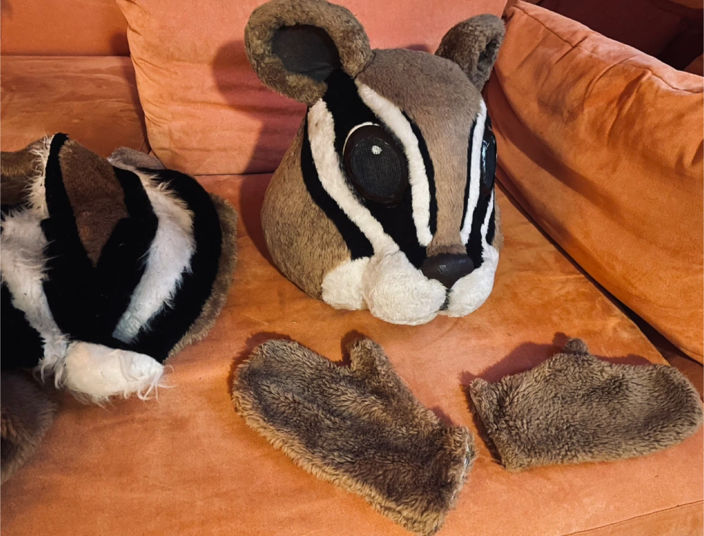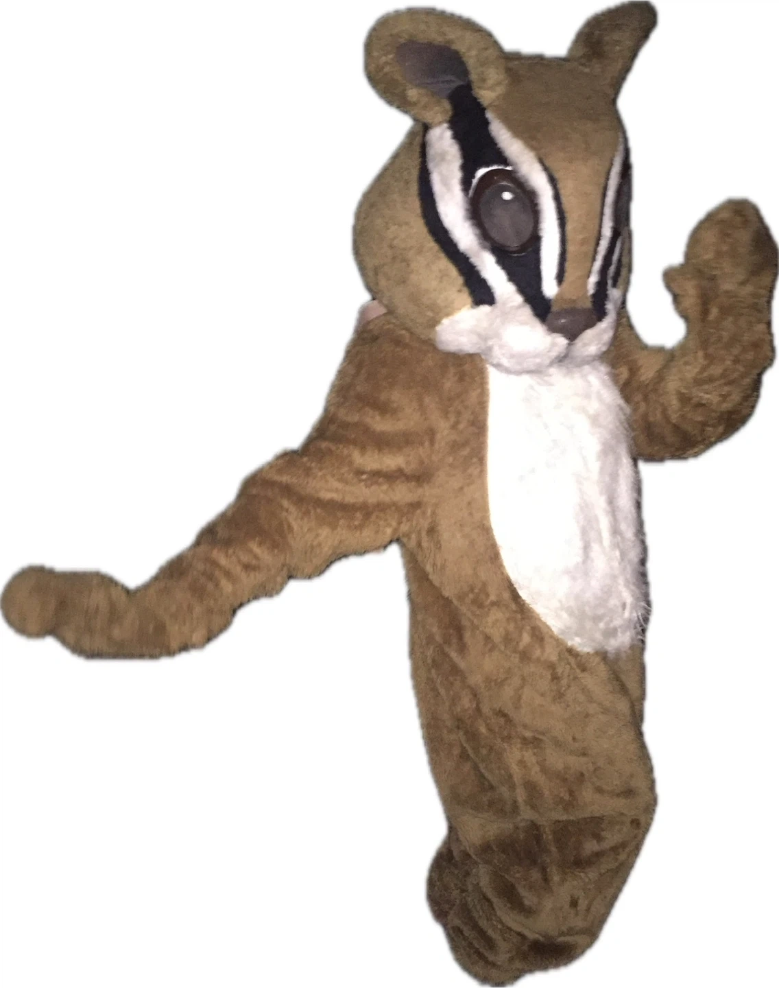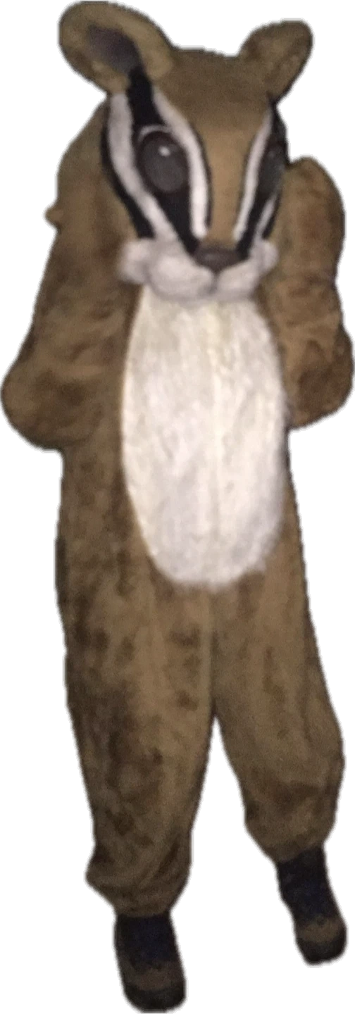 10Wear it this Halloween weekend! And again at a kids’ party or cosplay event. Beautiful, full-size adult costume of a chipmunk mascot or “fur suit,” handmade by a Toronto costume house. The “fur” is very detailed, with three fur colors: brown black and white. The chipmunk face has a friendly, classic, realistic look and is designed with ten beautiful and striking black-and-white stripes. There are five distinctive, wider stripes on the back, and the suit has a cutely shaped and stuffed upturned tail. There are four pieces: the head, the suit, and two mittens. The cute face and head are fully 3D shaped, with all facial features and ears solid-backed, and covered professionally in the fur colors. You can see through the open mesh in the big eyes, and there is an opening in the nose and mouth area as well for further ventilation. The suit is warm and cozy and easy to put on with its snap closures on the front. It comes with removable, soft “paw” mittens. The head piece is 16” tall, not including the ears. Length of the suit part of the costume is 63”. Approx 31” inseam.