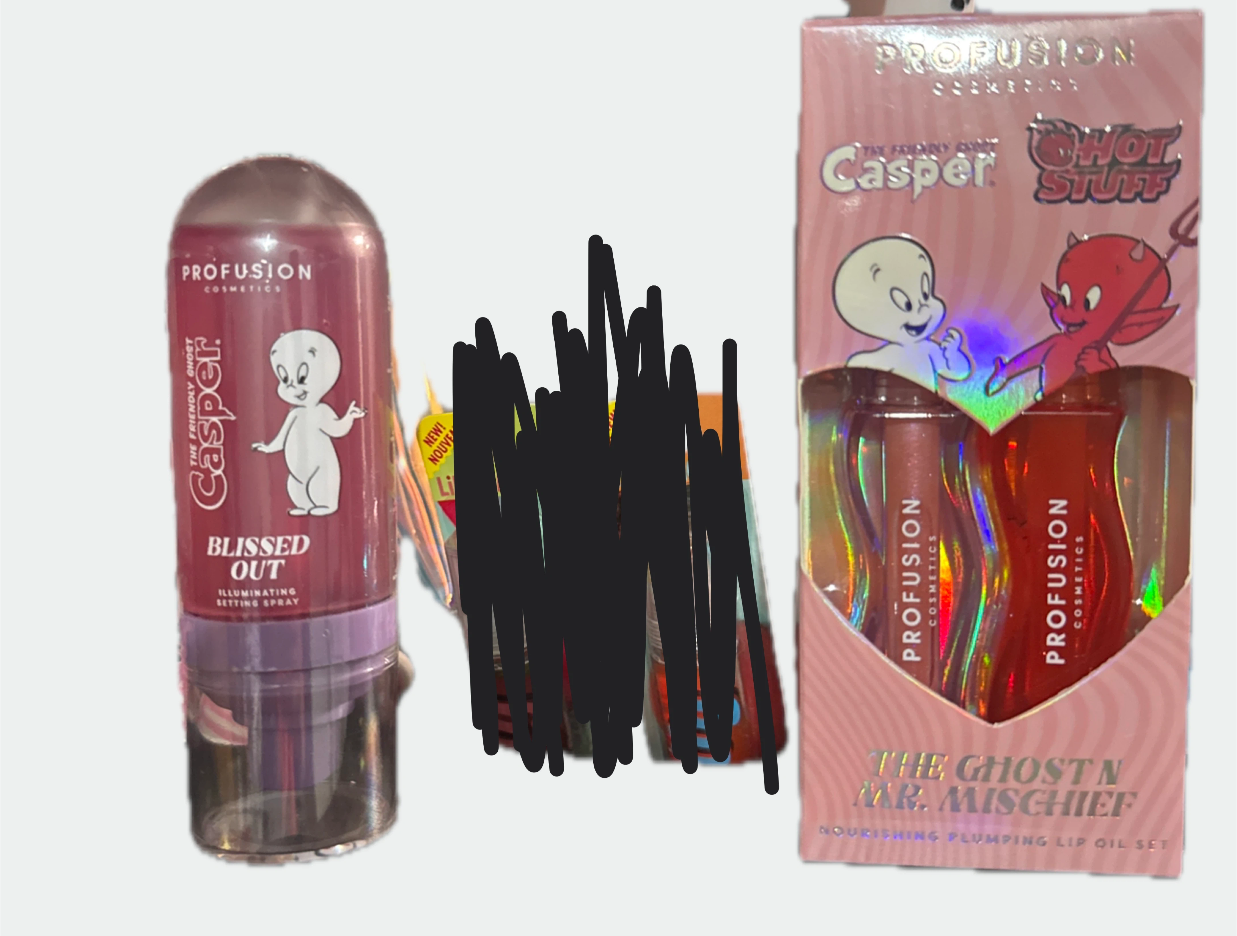 Selling a Profusion Cosmetics Casper themed makeup set! It includes: - Blisssed Out Illuminating Setting Spray - The Ghost & Mr. Mischief Nourishing Plumping Lip Oil Set $11 each