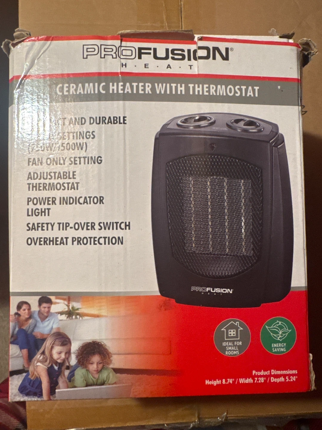 20This is a Profusion Heat ceramic heater with thermostat. It has durable settings (750W/1500W) and a fan only setting. It also features an adjustable thermostat, power indicator light, safety tip-over switch, and overheat protection. It's ideal for small rooms and is energy saving. The product dimensions are: Height 8.74", Width 7.28", Depth 5.24".