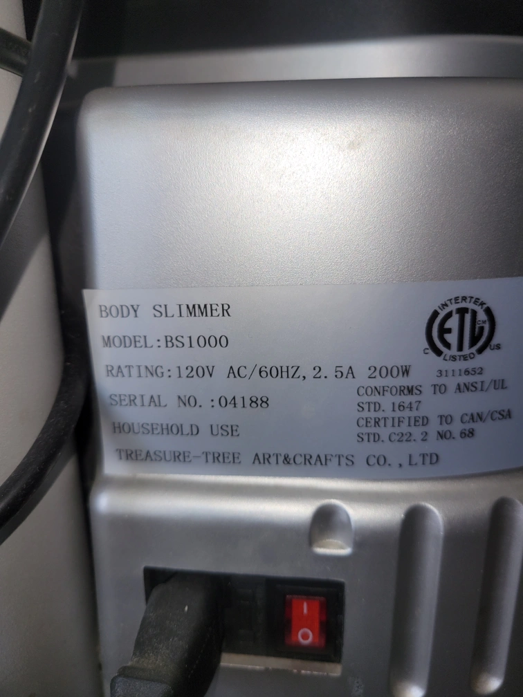 Selling a Progression Fitness Body Slimmer, model BS1000. This body slimmer is designed for household use and operates at 120V AC/60Hz, 2.5A, 200W. It's in good working condition and ready to help you achieve your fitness goals!