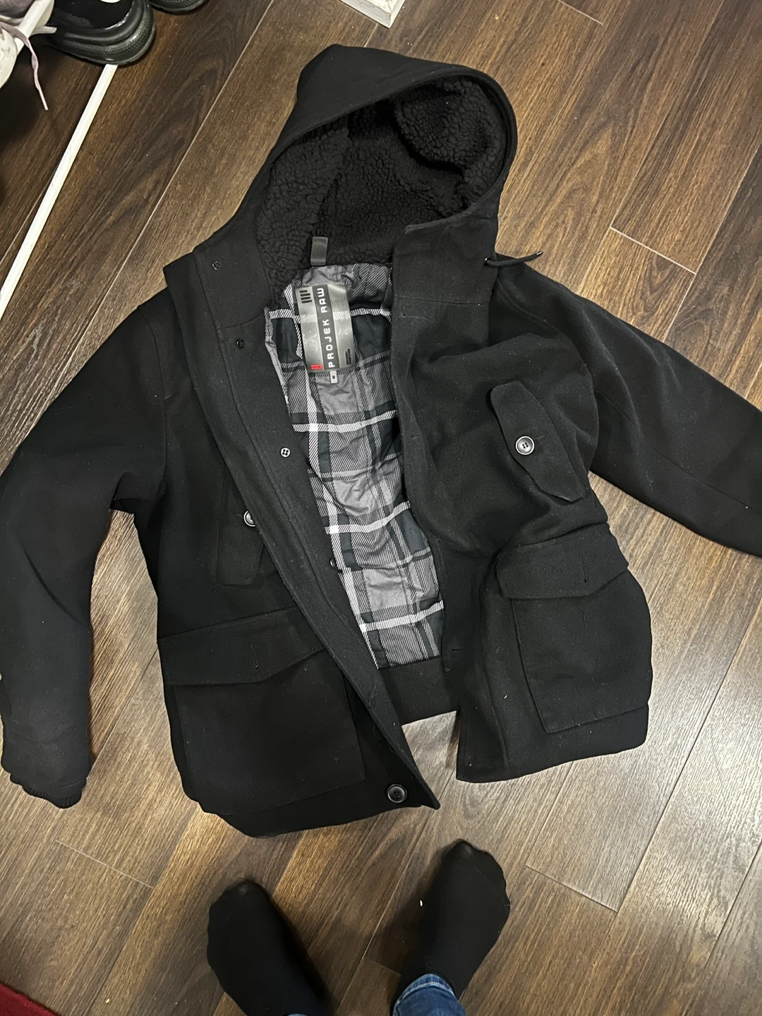 15Selling a Projek Raw black winter coat. It has a sherpa-lined hood and a plaid lining. Perfect for staying warm this winter!