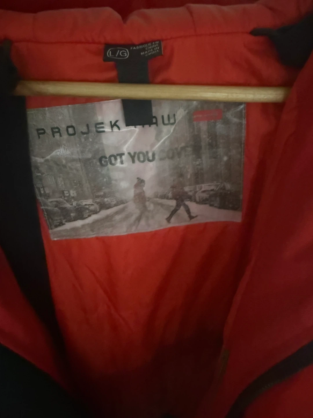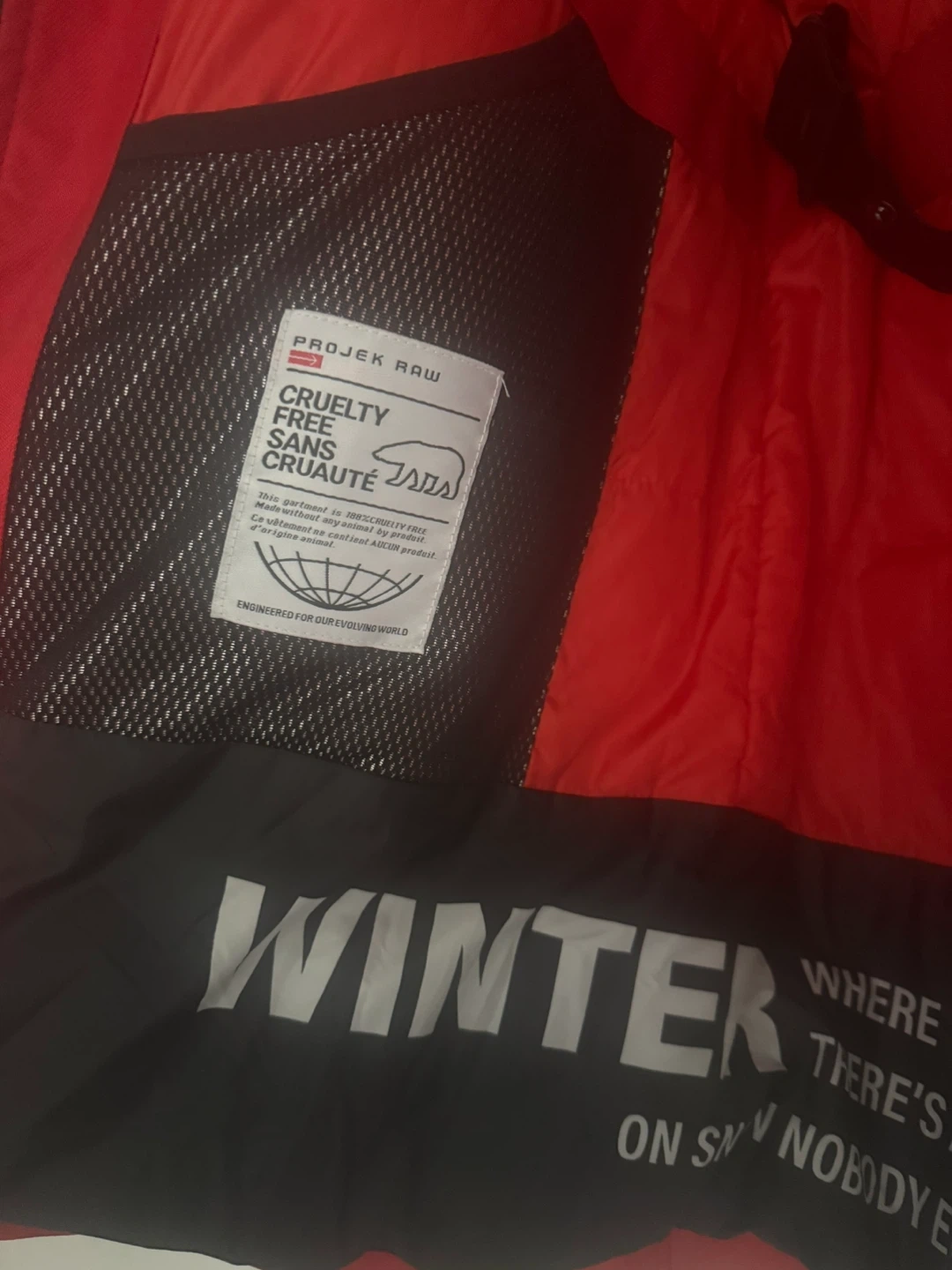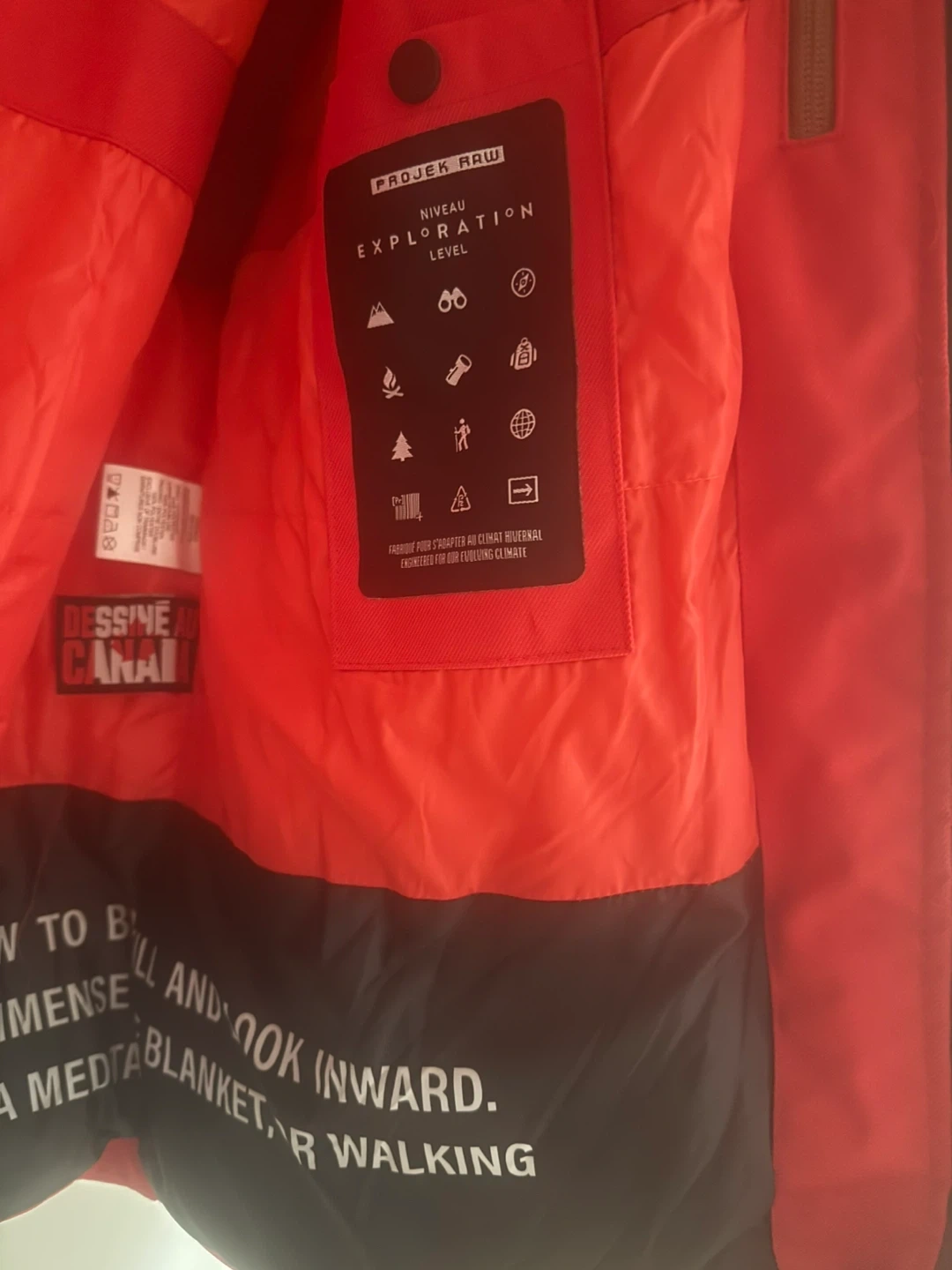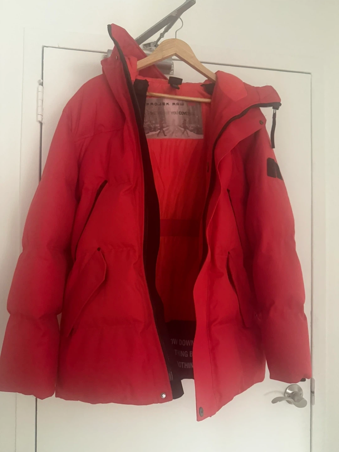 60Selling a bright red Projek Raw winter coat in size large! This coat is perfect for staying warm during the Canadian winter. It's in great condition and ready for a new owner