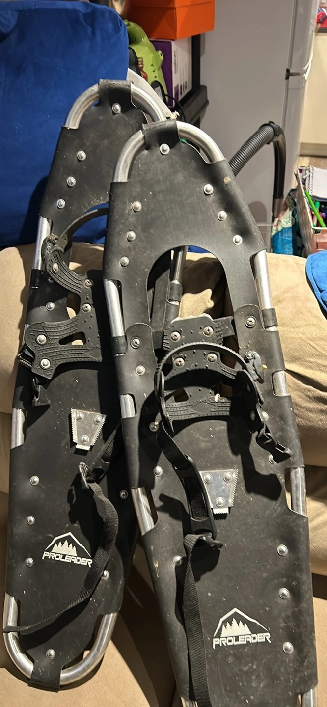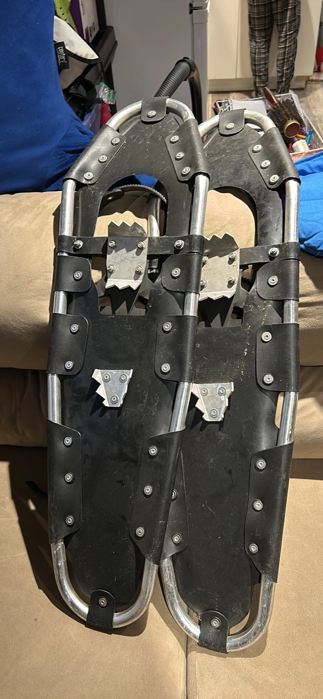 Pair of snowshoes with straps. Aluminum frame with black traction. Tow strap is damaged but ankle strap is good so still functional.