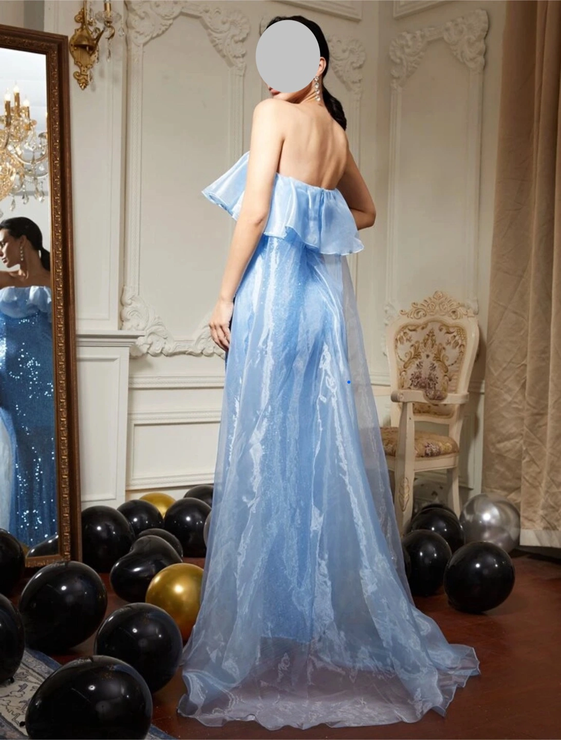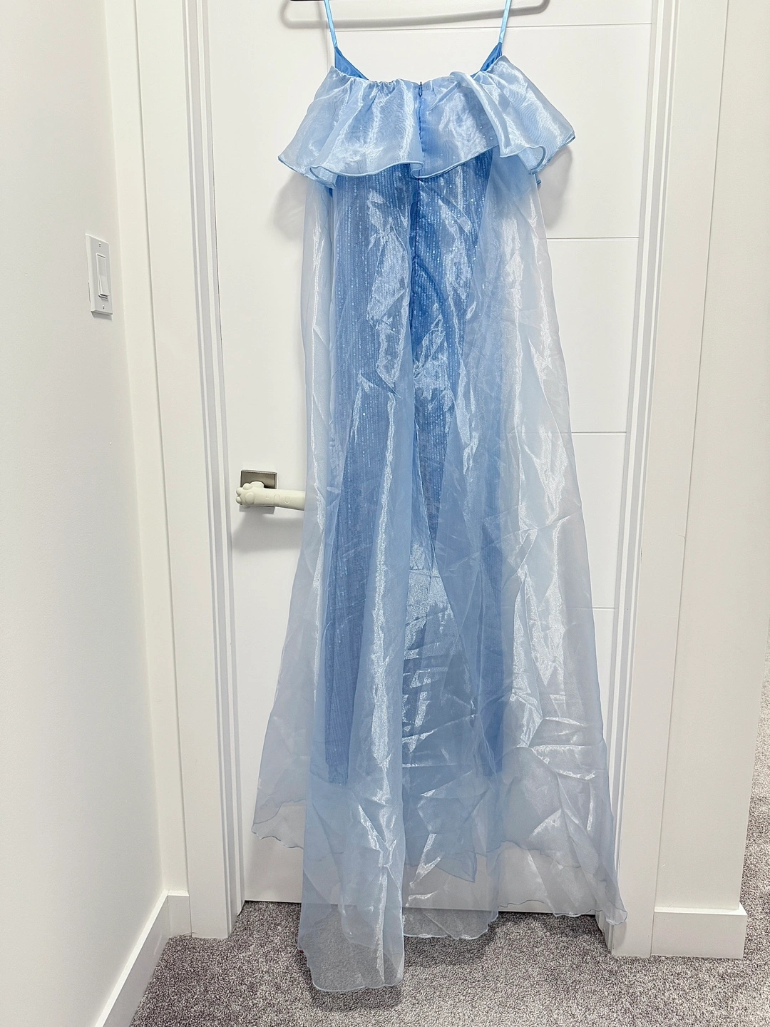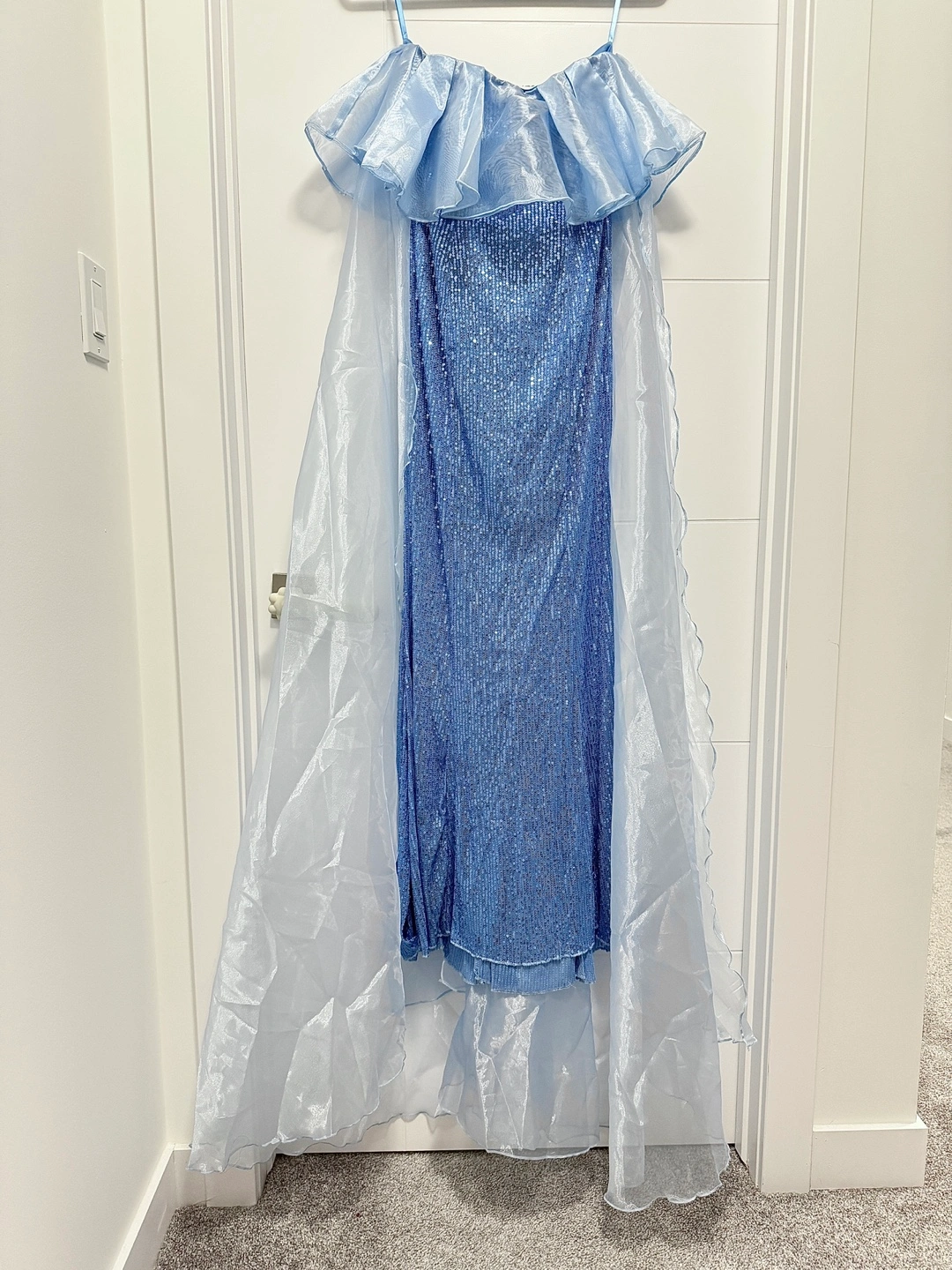 Brand new. Gorgeous light blue sequin mermaid-style gown. Features a ruffled off-the-shoulder neckline and a sheer organza overlay. Floor-length with a train. Perfect for a special occasion. Prom dress, wedding guest, party dress, evening dress. Medium, Slightly stretchy: Length: 131.3 cm, Bust:76 cm, Waist Size:72 cm.