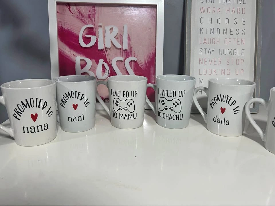 Celebrate new family roles with a custom wine glass! Add “Promoted to…” with names, dates, or glitter. Perfect for pregnancy reveals & gifts. Surprise them with a sip-worthy promotion! These custom wine glasses or mugs are the perfect way to celebrate a growing family or announce exciting news. Popular ideas include: • “Promoted to Grandma” • “Promoted to Auntie 2025” • “Promoted to Big Sister” • “Promoted to Gigi, Nana, Nonna, Titi…” (any name you use!) Customize with: • Name & title • Year or date • Glitter or plain vinyl • Font style & color Perfect for: • Pregnancy announcements • Gender reveal surprises • Baby shower gifts • New grandparents, aunts, uncles & sibling