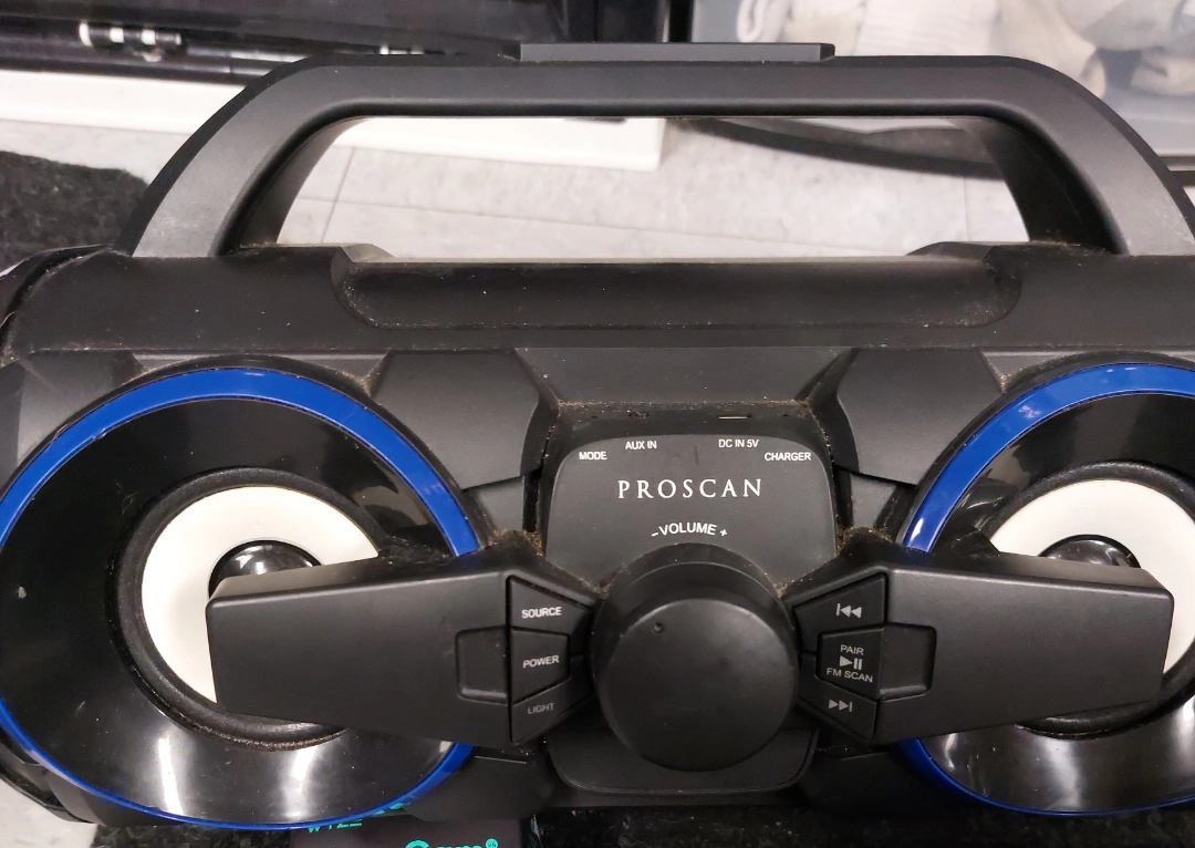 Selling a portable boombox by Proscan. It has a handle on top for easy carrying. You can connect via AUX in, or use the FM scan function. It also has a light!