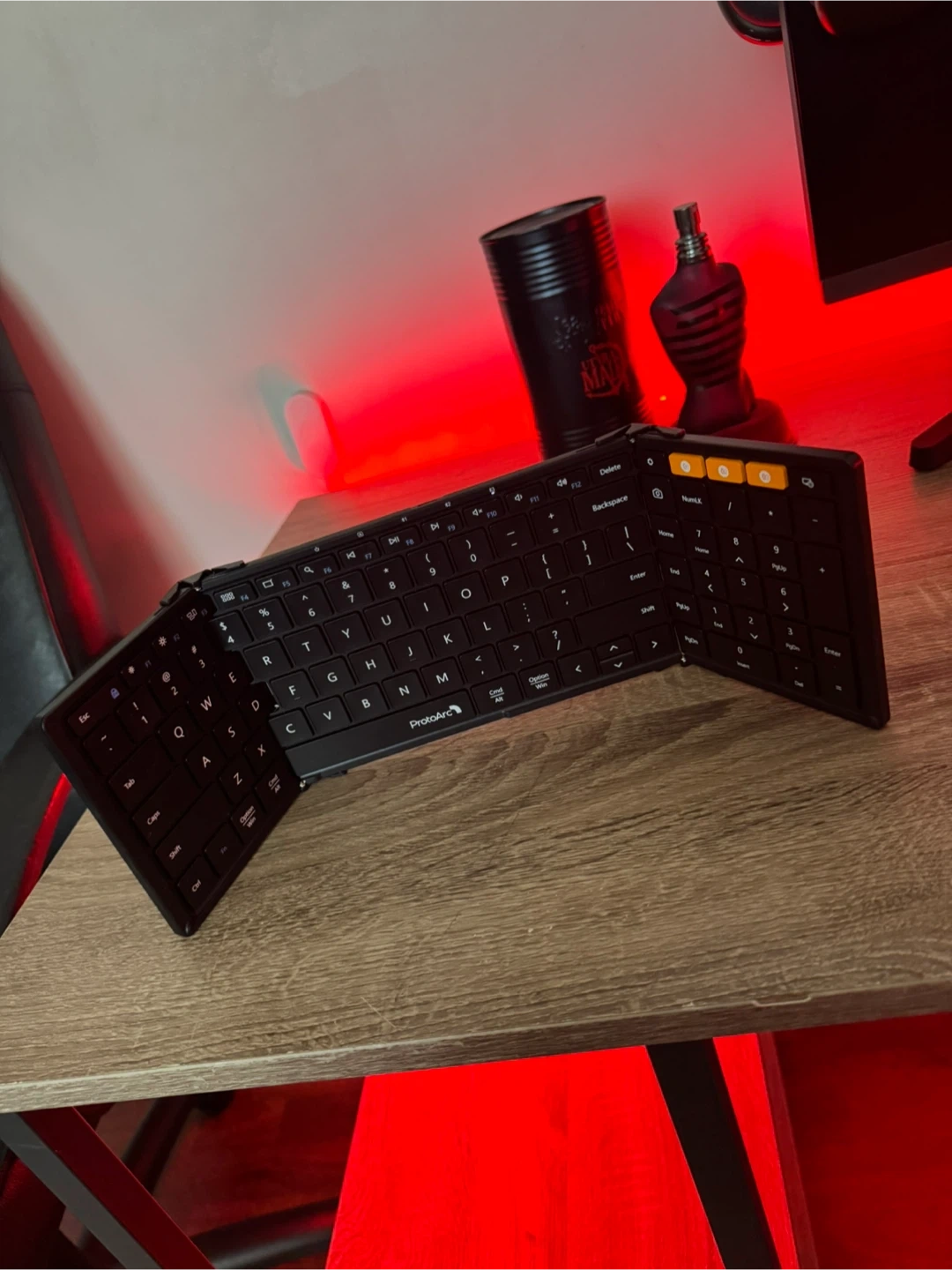 Selling a ProtoArc folding keyboard + stand in black! It's perfect for holding your phone or tablet while you type. The stand is adjustable to different angles, making it easy to find the perfect viewing position. It's also lightweight and portable, so you can take it with you wherever you go.