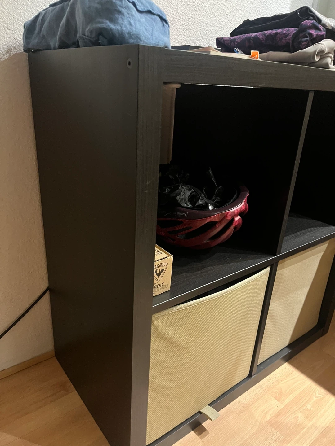 A black IKEA KALLAX shelf unit with two tan storage bins. It's a 2x2 cube configuration. Perfect for organizing items in your living space. Holds books, decor, or small appliances.