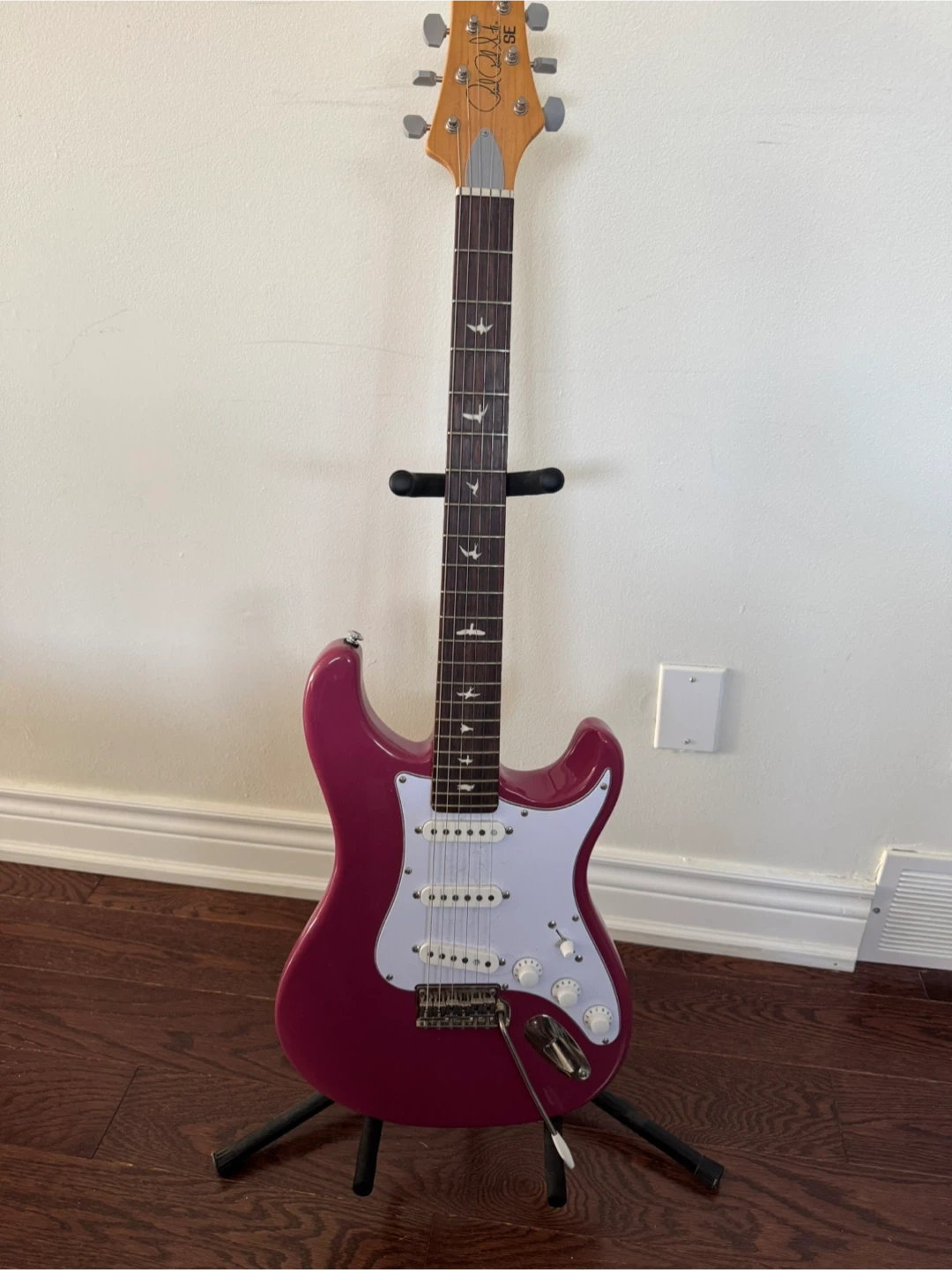 Selling a Fender PRS SE electric guitar in a beautiful raspberry finish! It's in great condition and ready for a new home. This guitar is perfect for anyone looking for a versatile and reliable instrument. Feel free to reach out if you're interested or have any questions