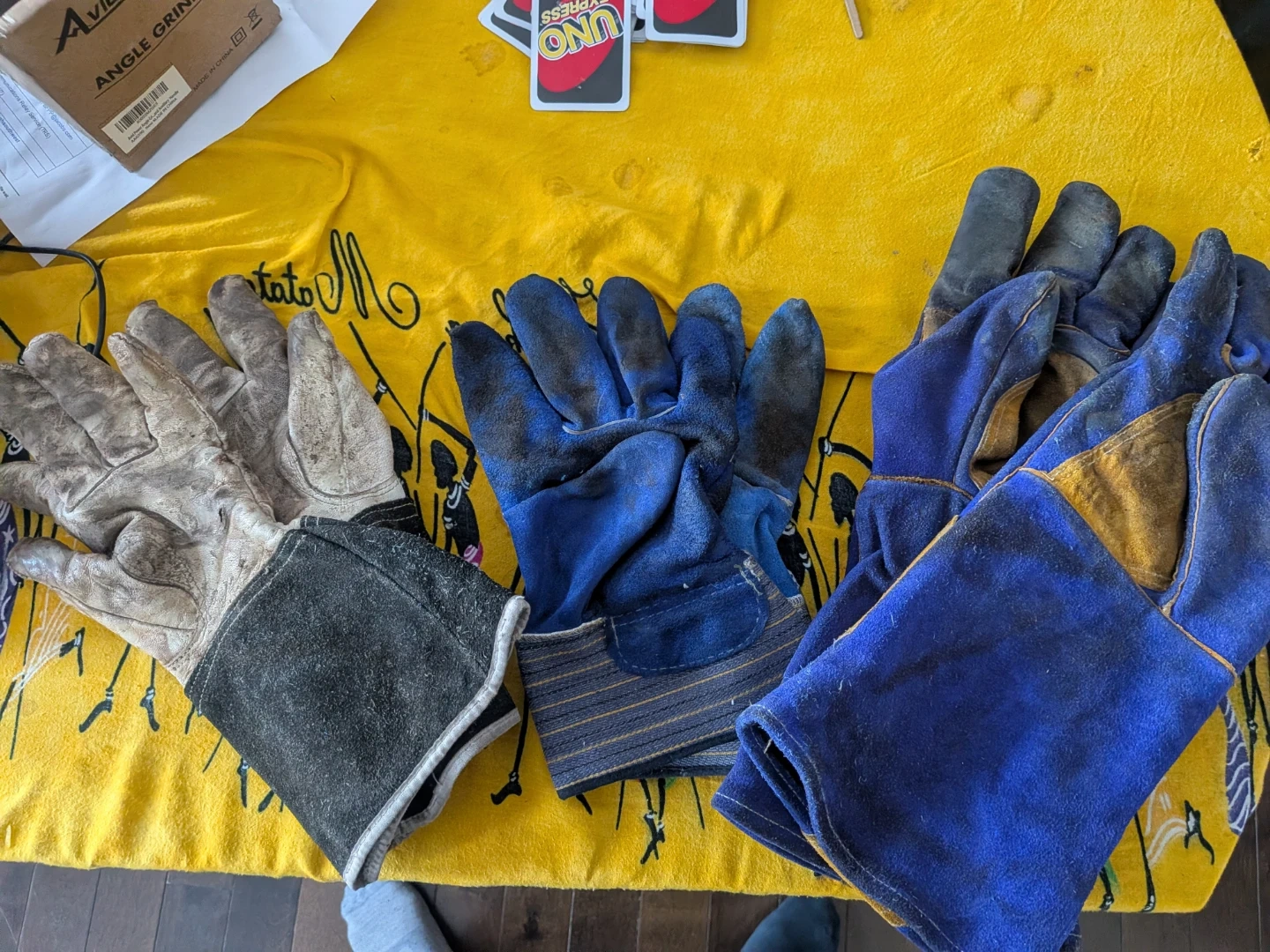 Then, welding gloves, three of them different, one is superior's brand and others main quality leather. All three for only 50$. Used like new. Intact in quality.