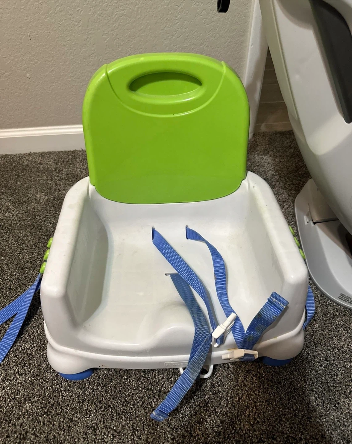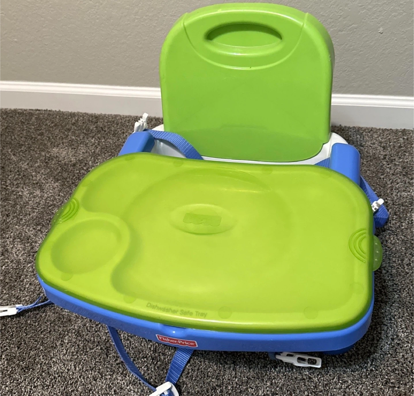 This Fisher-Price booster seat is great for mealtimes. It's easy to clean, and the tray is dishwasher safe. Straps are included for securing it to a chair.
