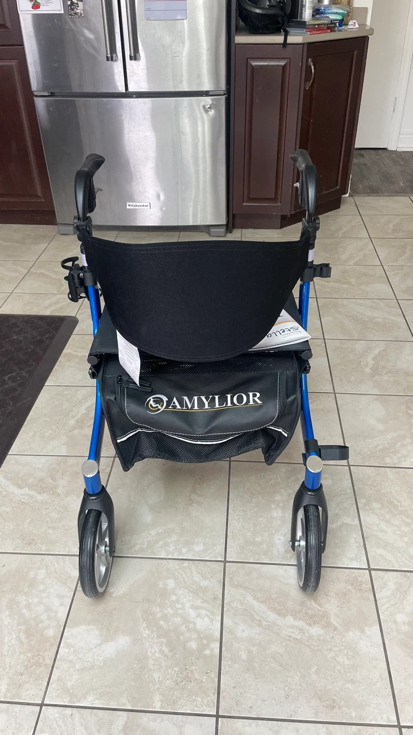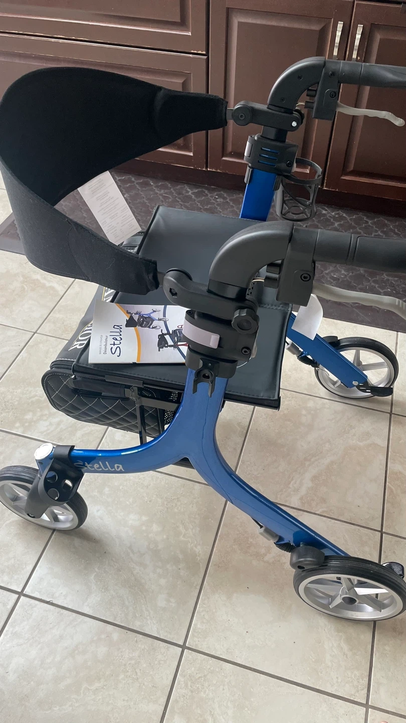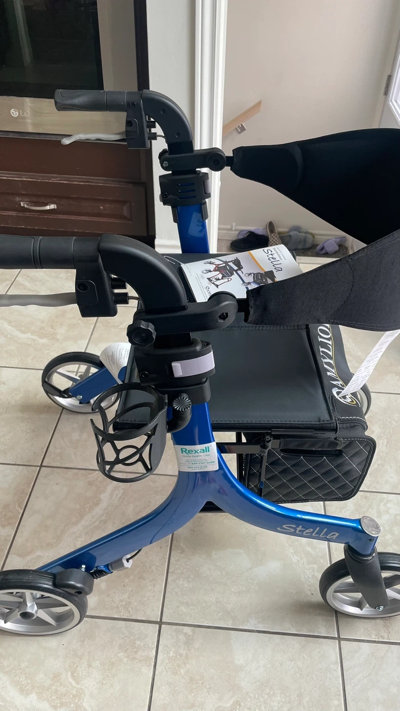 This Stella rollator walker is blue and features a comfortable seat with a storage bag. It also includes a cup holder and adjustable handlebars. Weighs 14lb, Never has been used before!