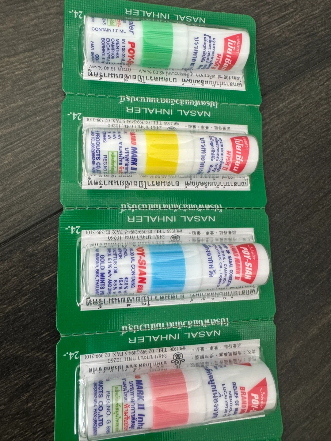 These are Hong Thai Compound Herb Inhalers. Each inhaler contains herbs and menthol.