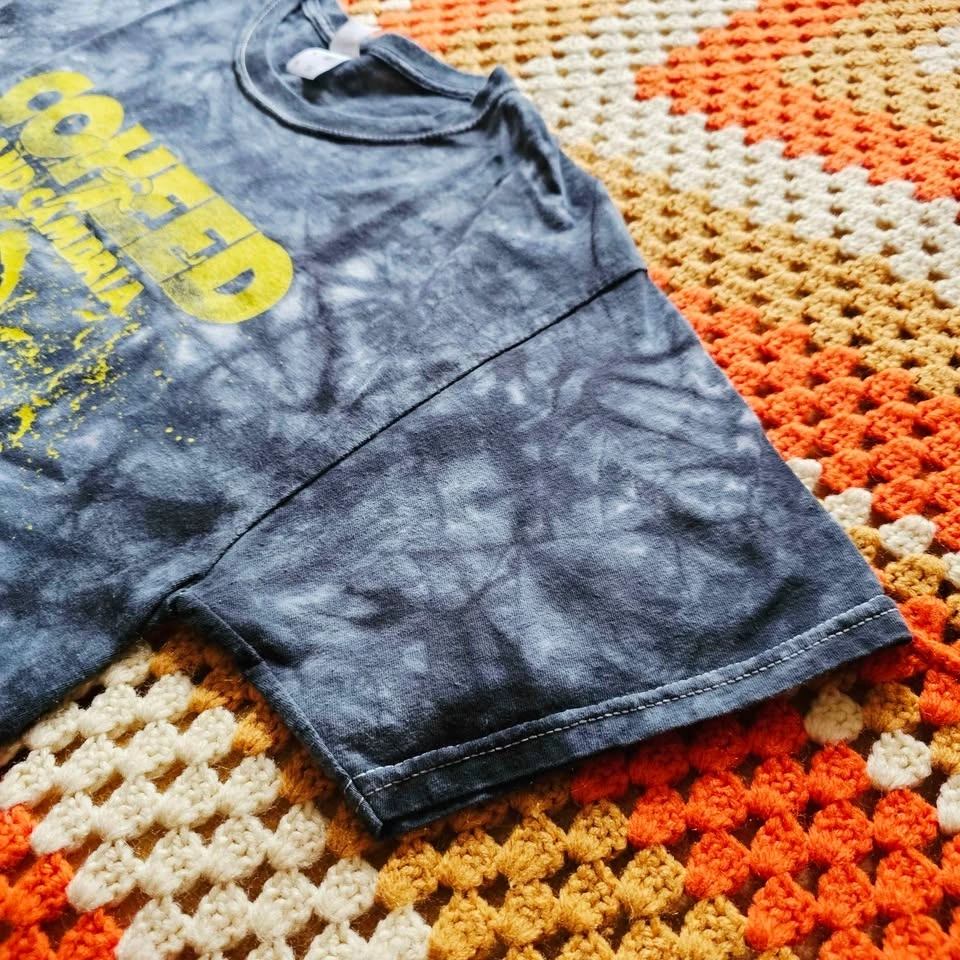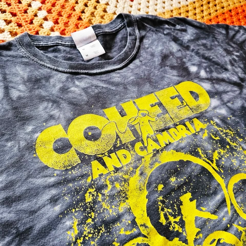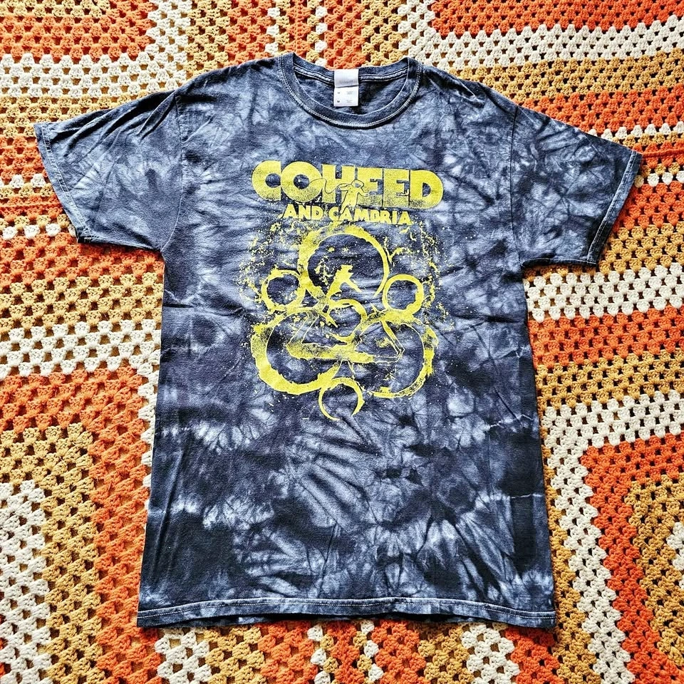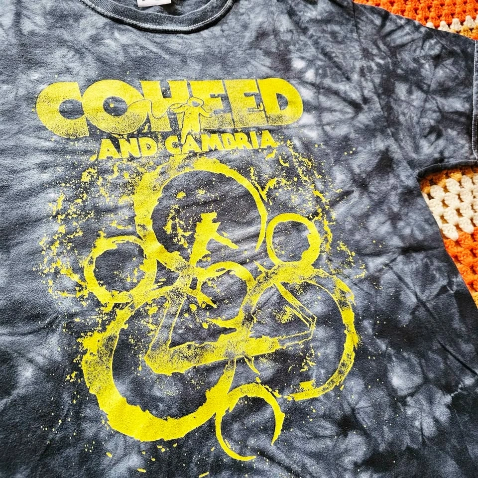 Vintage Coheed and Cambria grey and black tie dye band tee, featuring their iconic Keywork logo in bright yellow.