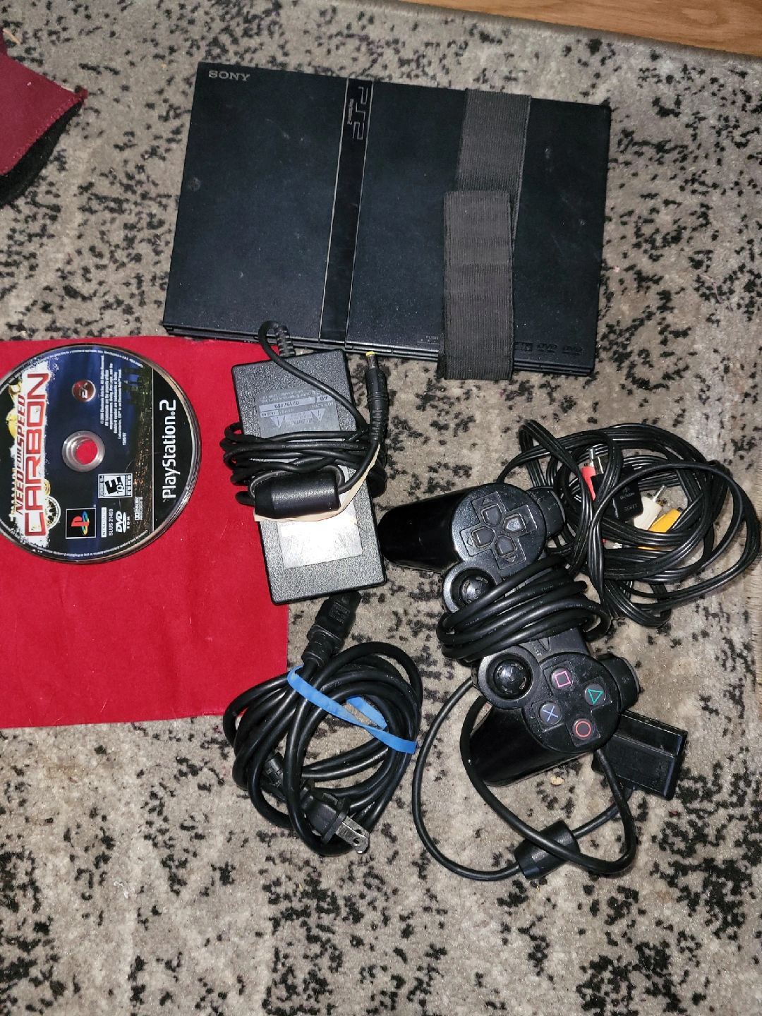 75- Public meet in Niagara Falls, ON - The strap hold the lid shut - Everything Works - I'm downsizing for studies - Ps2 Slim With Controller, AV cable, Ac Adapter, 2 Prong AC Power Cord - Comes with 8 free games
