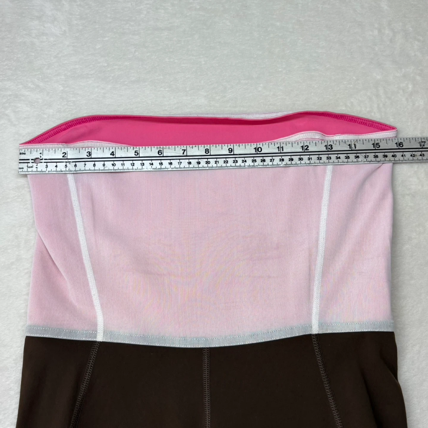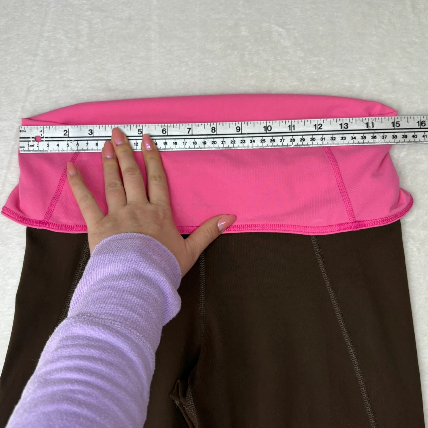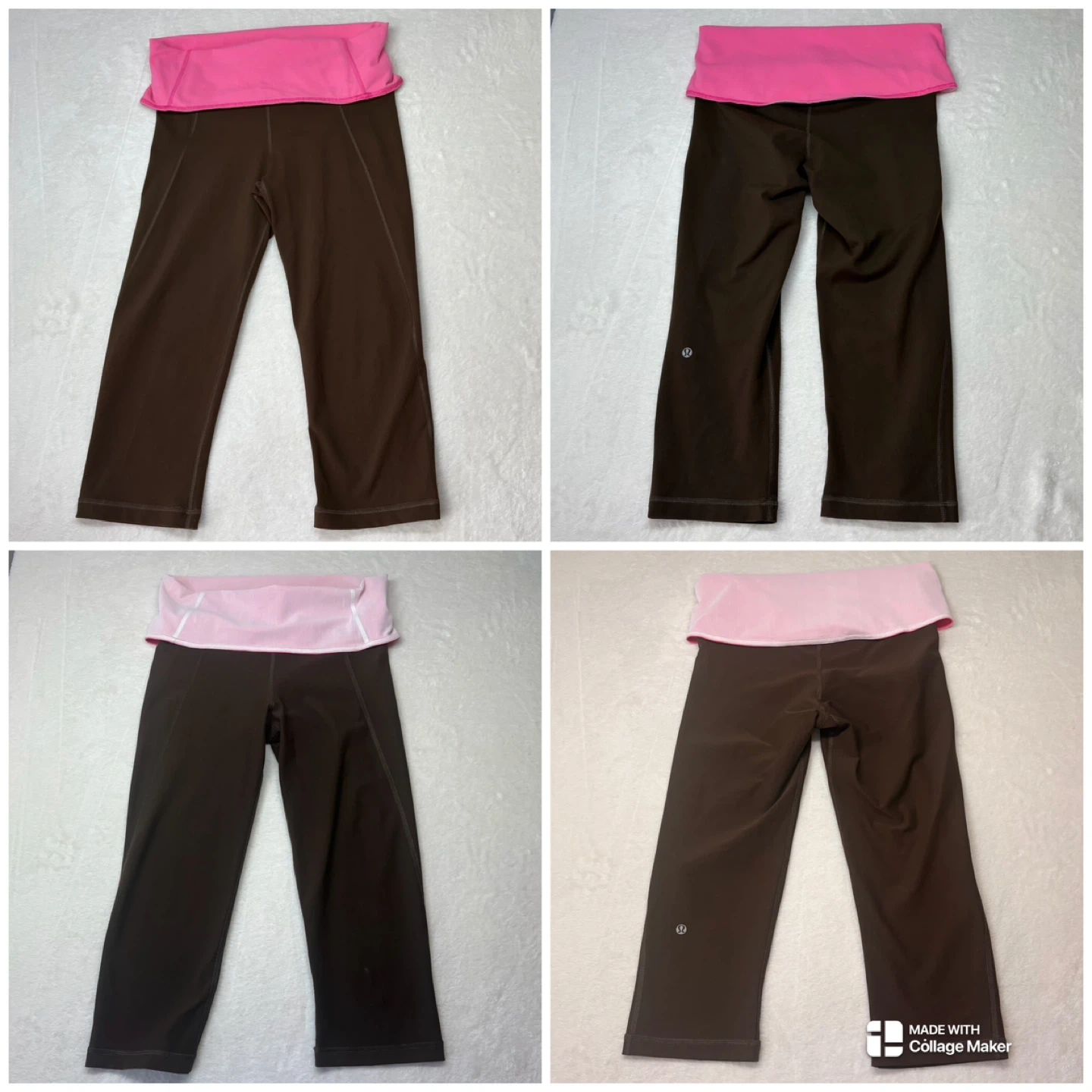 Vintage reversible Lululemon Groove Crops in a chocolate brown and bubblegum pink colorway. Features a unique white circle mesh foldover waistband for added breathability and texture. These crops are highly versatile with a reversible design and the signature reflective logo on the calf of both sides.