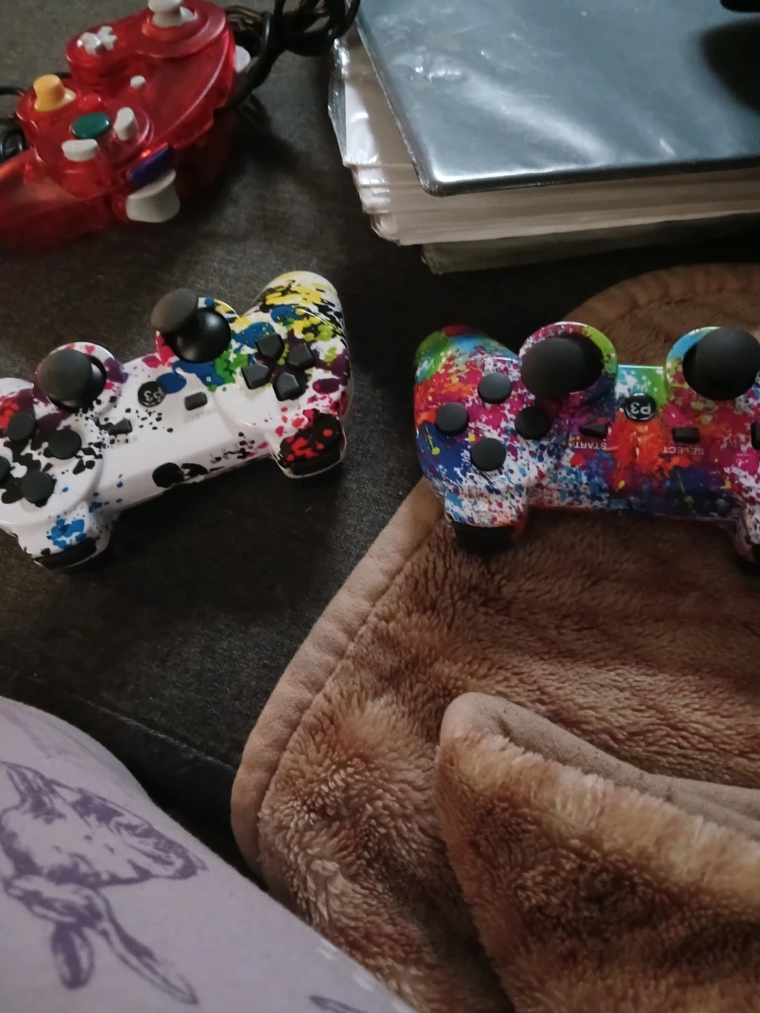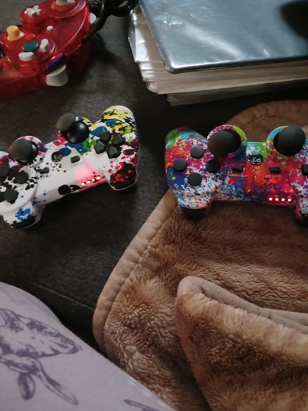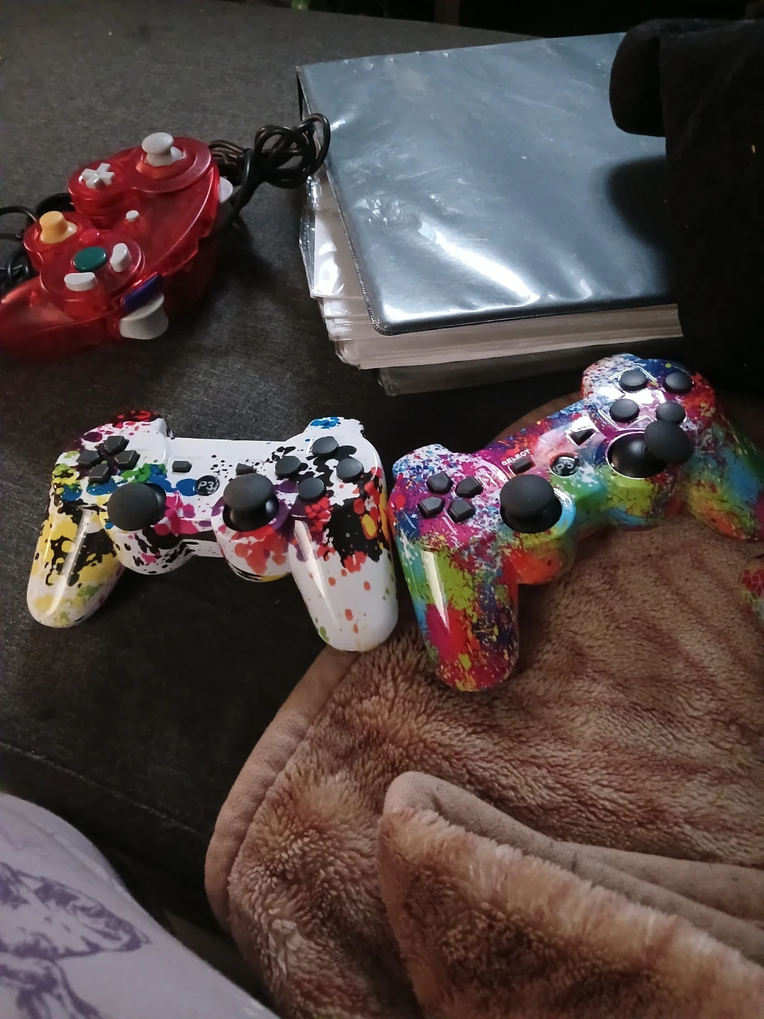 60Selling some custom painted PS3 controllers! They're in good condition and ready for a new home. One is white with black and the other is a colourful paint splatter design they work as per video. The Nintendo game cube controller is am not sure. Looking for 5 dollars each.