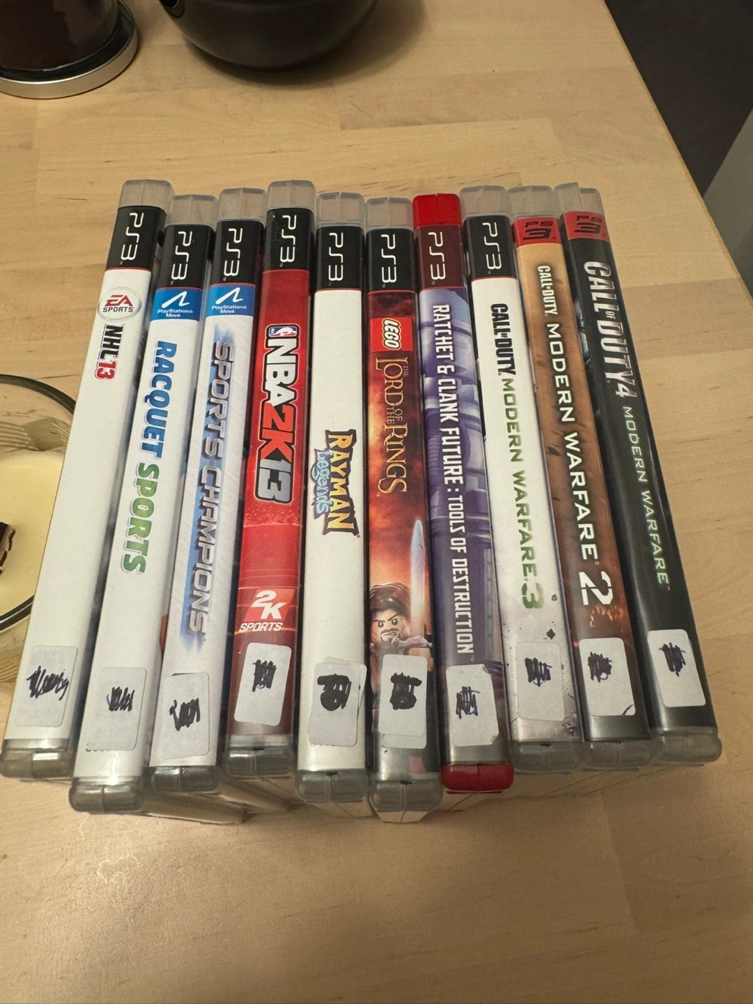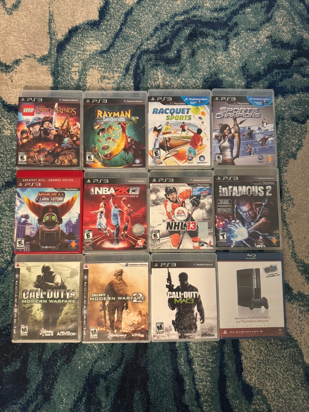 655Bundle of 15 PS3 games. Games include NHL 13, Racquet Sports, Sports Champions, NBA 2K13, Rayman, Lego Lord of the Rings, Ratchet & Clank Future: Tools of Destruction, Call of Duty Modern Warfare 3, Call of Duty Modern Warfare 2, Call of Duty 4, Infamous 2, NBA 2K12, NHL 13, and Call of Duty: Modern Warfare 3. $40 For All Or $10 Each