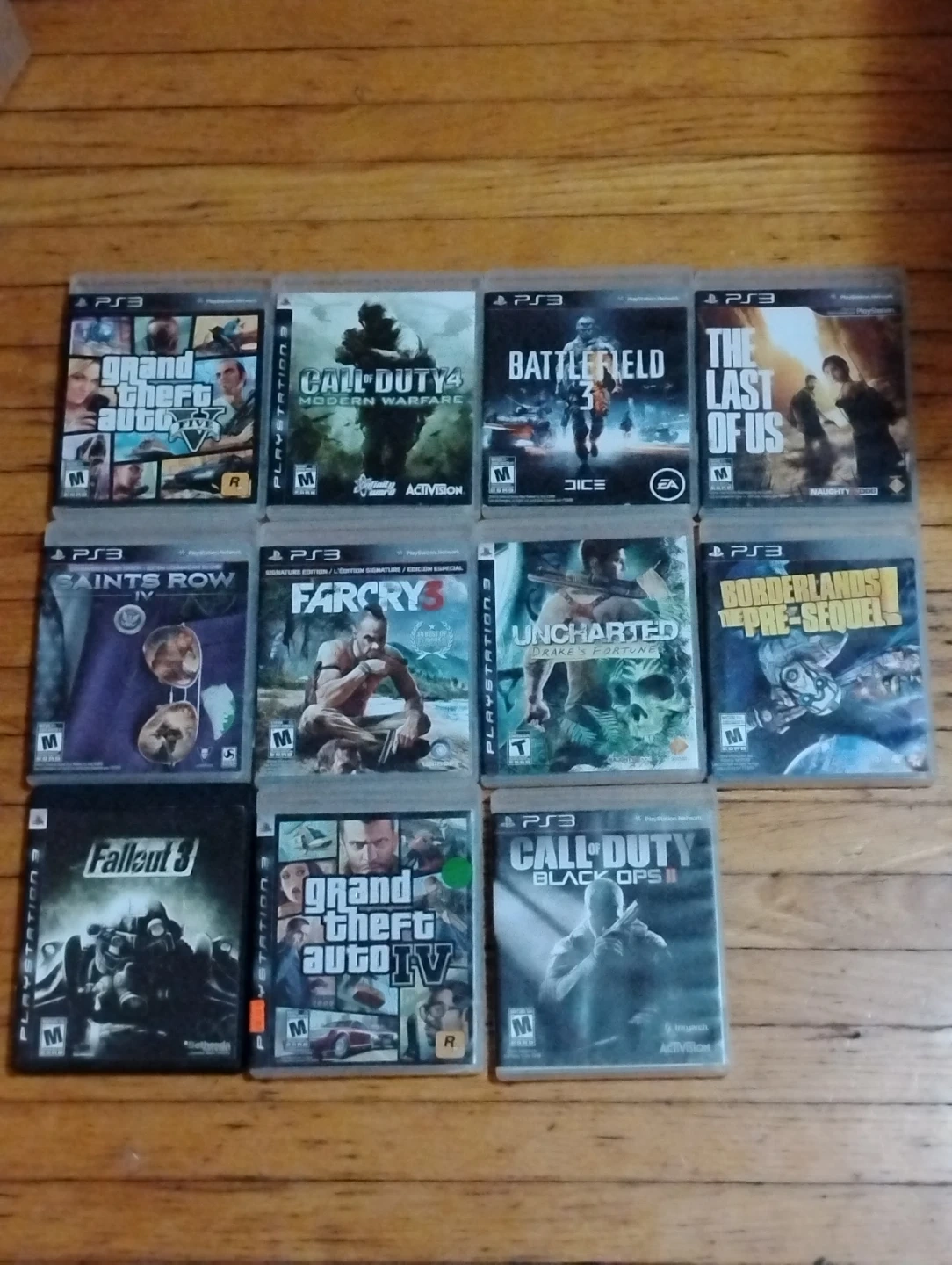 10Selling a collection of PlayStation 3 (PS3) games! Titles include: - Grand Theft Auto V - Call of Duty 4: Modern Warfare - Battlefield 3 - The Last of Us - Saints Row IV - Far Cry 3 - Uncharted: Drake's Fortune - Borderlands: The Pre-Sequel - Fallout 3 - Grand Theft Auto IV - Call of Duty: Black Ops II