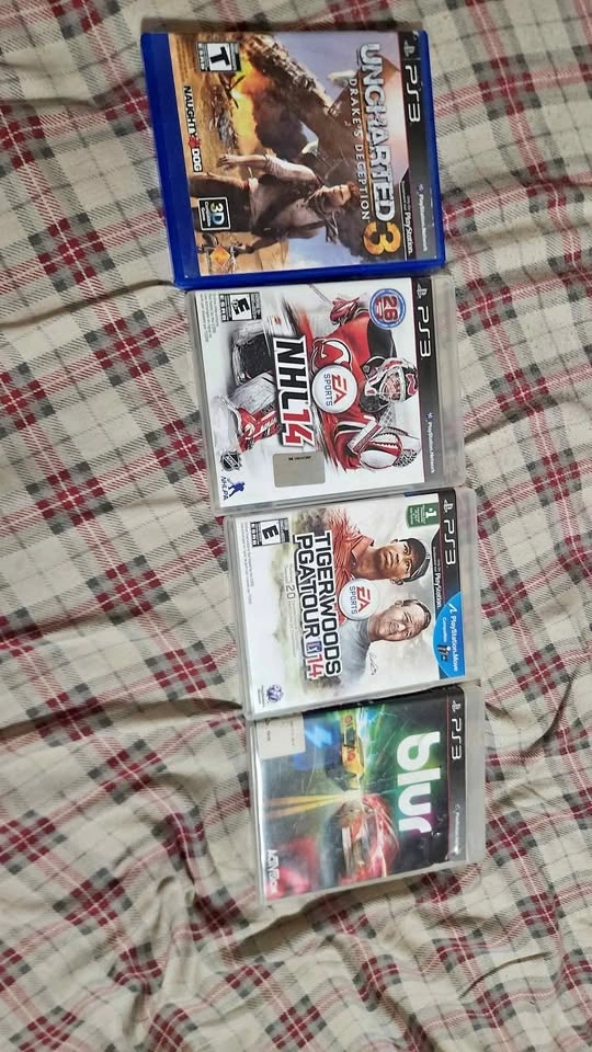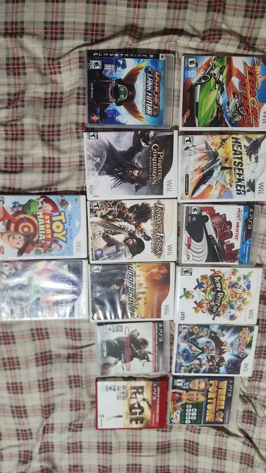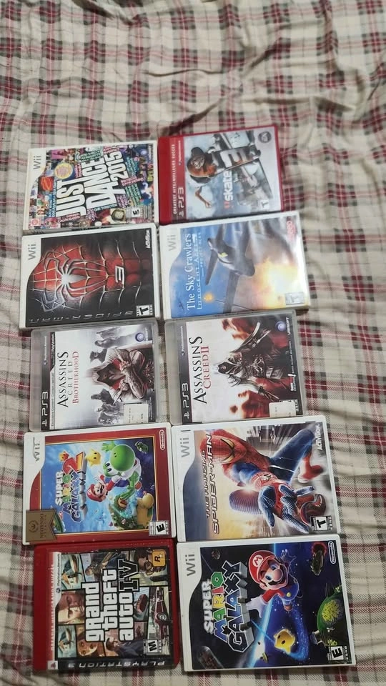 Selling a bundle of 28 games for Wii and PS3. All discs are in good condition and tested. I can also sell 1 by 1 if you want. All discs come with the cover/disc holder. Price can be a little negotiable depending on the game/games Wii games: Spider-Man 3 – $10 (Manuel included) Super Mario Galaxy 2 – $25 Super Mario Galaxy – $20 (Manuel included) The Sky Crawlers: Innocent Aces – $20 (Manuel included) Just Dance 2015 – $10(Manuel included) The Amazing Spider-Man – $15 (Manuel included) Toy Story Mania! – $12 (Manuel included) Ben 10: Cosmic Destruction – $12 Beyblade: Metal Fusion – $10(Manuel included) Heatseeker – $13(Manuel included) Pirates of the Caribbean: At World’s End – $7 Prince of Persia: Rival Swords – $7 (Manuel included) Army Rescue – $5 Hot Wheels: Track Attack – $8(Manuel included) Need for Speed: Undercover – $8(Manuel included) PS3 Games: Grand Theft Auto IV – $15 Assassin’s Creed II – $8(Manuel included) Assassin’s Creed Brotherhood – $8 (Manuel included) Uncharted 3: Drake’s Deception – $5 Blur - (Pending) NHL 14 – $5(Manuel included) Wheel of Fortune – $8 Skate 3 – $18(Manuel included) Rage – $5(Manuel included) Tiger Woods PGA Tour 14 – $13(Manuel included) Ratchet & Clank Future: Tools of Destruction – $10(Manuel included) Crysis 2 – $10(Manuel included) Need for Speed: Most Wanted – $12(Manuel included)