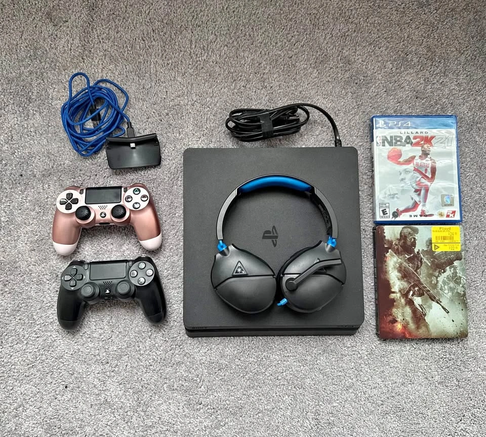 Selling a complete PS4 gaming setup. This bundle includes: PS4 Console Turtle Beach Wired Headset Two Controllers – Includes a rechargeable battery pack 2K21 (Physical Disc) COD: Black Ops 4 (Physical Disc)