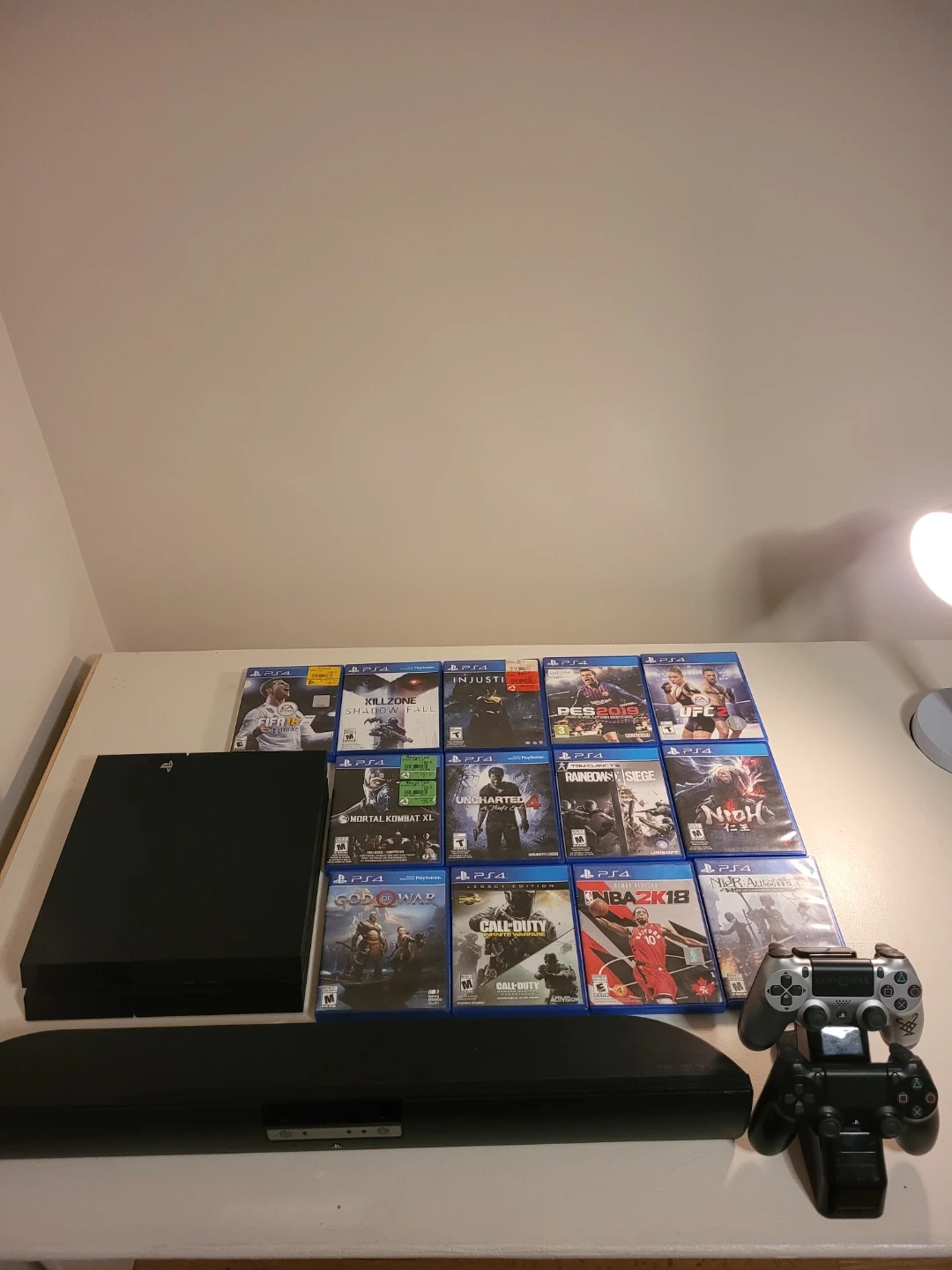 165Playstation 4 --1 TB-- Trade available read the description. Came with its box. (Power cords and hdmi cable included) God of war controller Standard controller Authentic playstation soundbar and remote 12 games -God of War -Mortal Kombat XL -Call of Duty Infinite Warfare -Rainbow Six Siege -Uncharted 4 -PES 2019 -NBA2K18 -Final Fantasy 4 -UFC 2 -NIOH -NIER AUTOMATA -Killzone Shadow Fall Can trade with ; Iphone 13 Pro Max Ipad Macbook M1 Archery Limbs or/and Riser (HOYT, WIN&WIN) Easton carbon one nfused 450 spine arrows.