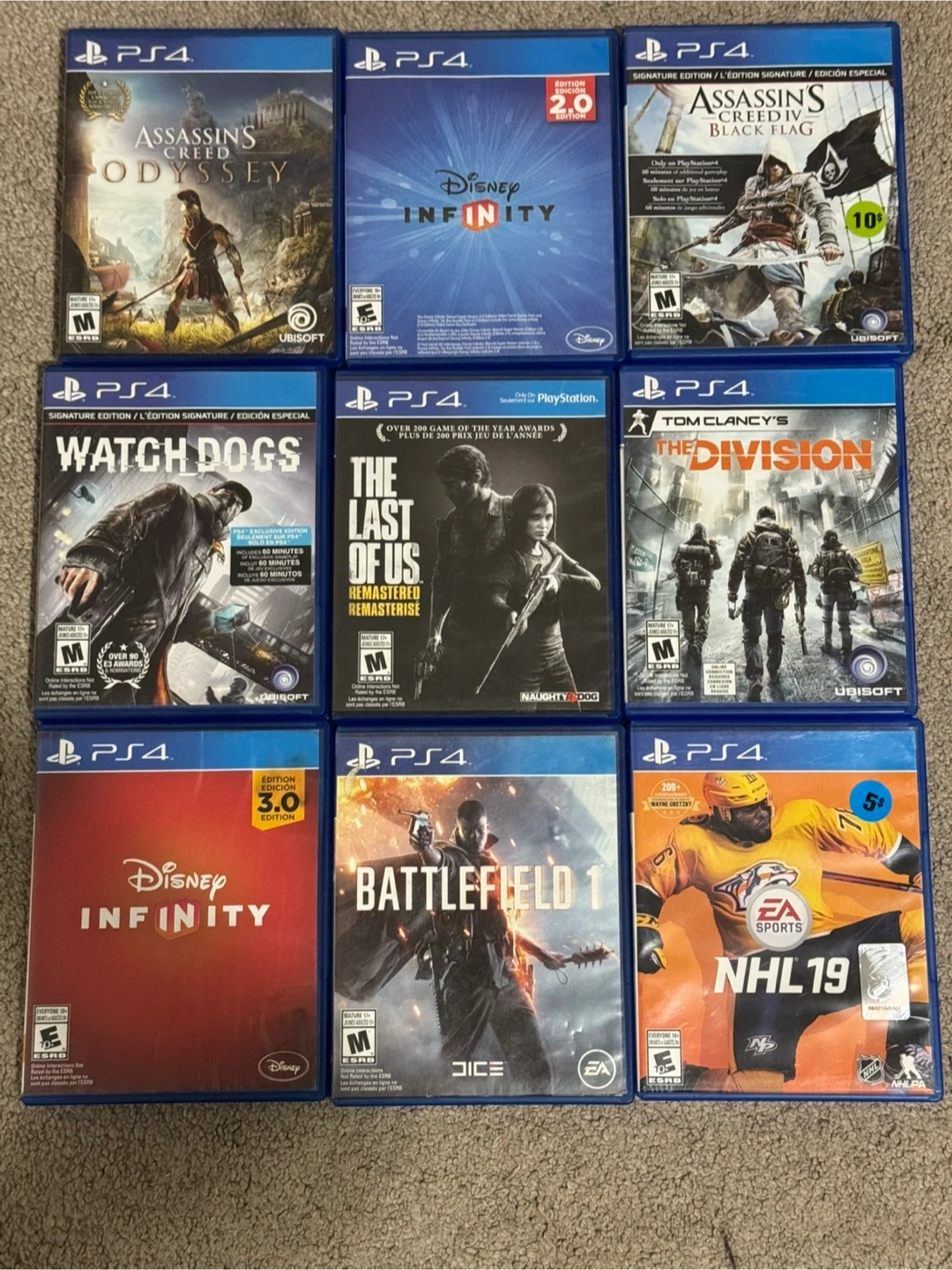 68Selling a bundle of PS4 games, all in great condition! Includes titles like: - Assassin's Creed Odyssey - Watch Dogs - Disney Infinity (2.0 and 3.0 Editions) - Battlefield 1 - NHL 19 - Tom Clancy's The Division - The Last of Us Remastered - Assassin's Creed IV Black Flag Some or $ 5 or more than 5 message for individual prices or take all for $ 60 Thanks.