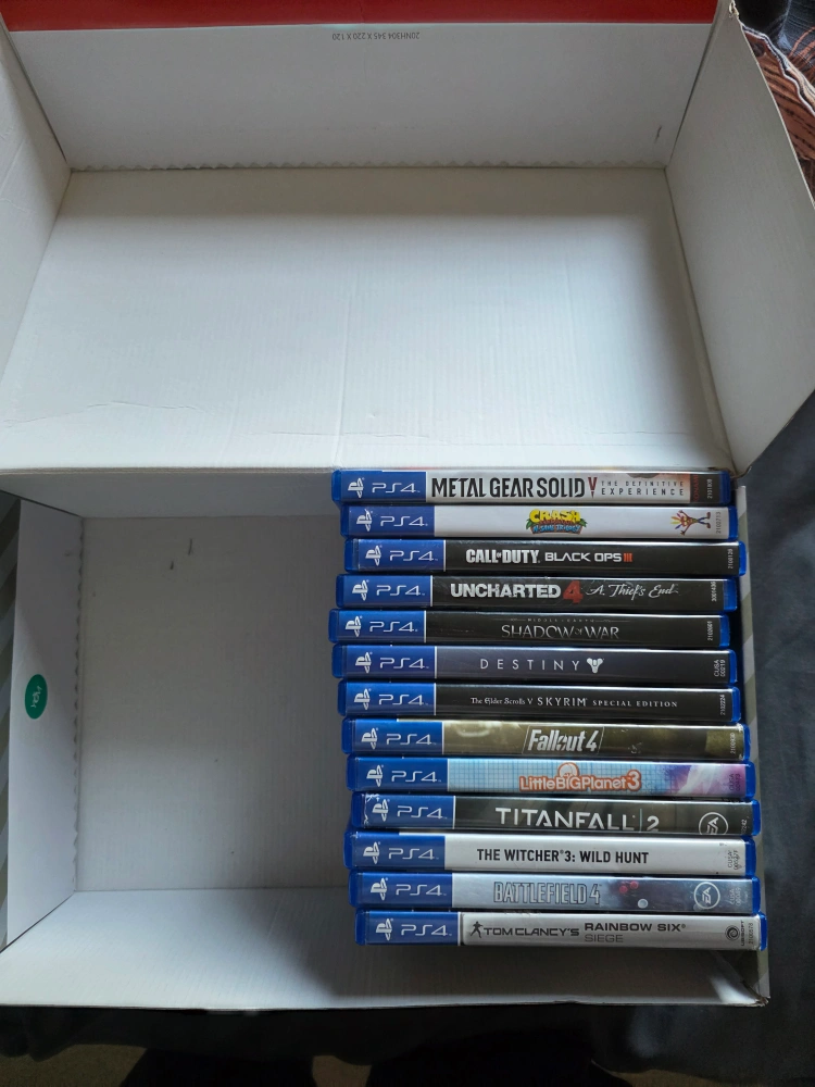 Selling a collection of PS4 games! Titles include Metal Gear Solid V, Call of Duty Black Ops III, Uncharted 4: A Thief's End, Shadow of War, Destiny, Elder Scrolls V Skyrim Special Edition, Fallout 4, Little Big Planet 3, Titanfall 2, The Witcher 3: Wild Hunt, Battlefield 4, and Tom Clancy's Rainbow Six Siege. Individual games for $10 or you can buy them all for $70