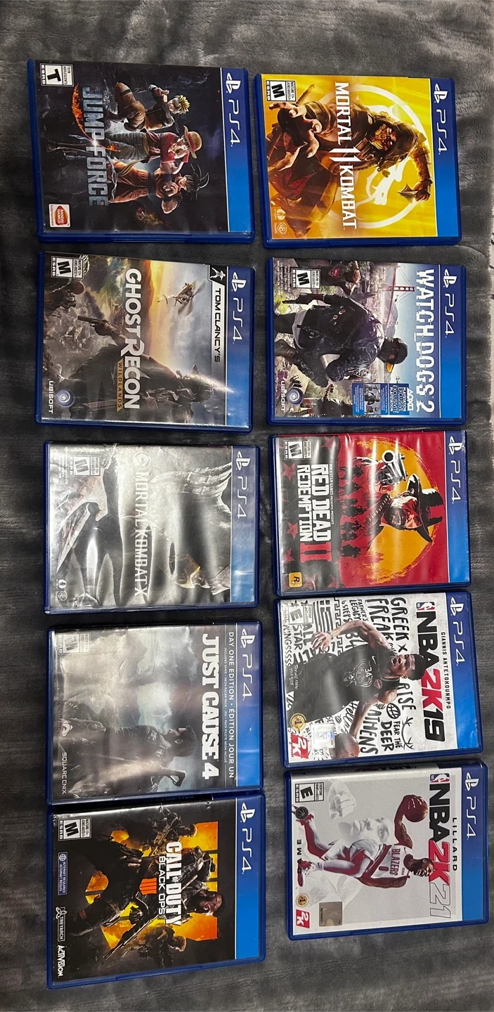 10Selling a collection of PS4 games! Titles include: - Jump Force - Mortal Kombat 11 - Ghost Recon Wildlands - Watch Dogs 2 - Mortal Kombat X - Red Dead Redemption II - Just Cause 4 - NBA 2K19 - NBA 2K21 - Call of Duty Black Ops All games are in good condition and ready for a new player!