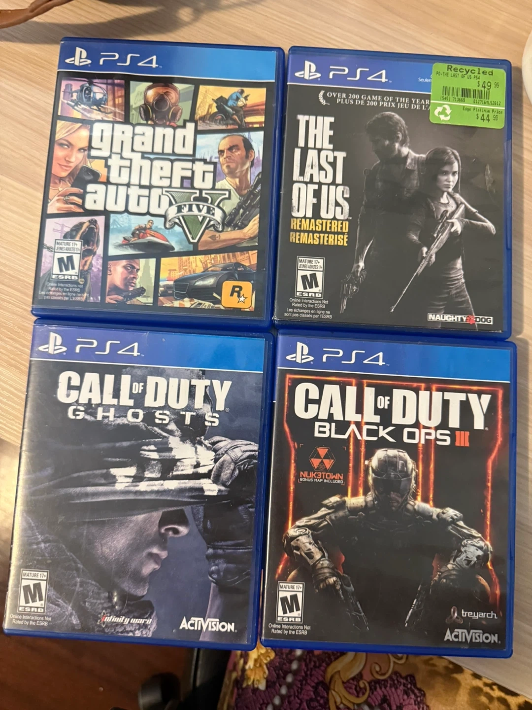 Selling a collection of PS4 games! ALL FOR 40 or 10$ each Includes: - Grand Theft Auto V - The Last of Us Remastered (originally $49.99) - Call of Duty Ghosts - Call of Duty Black Ops III