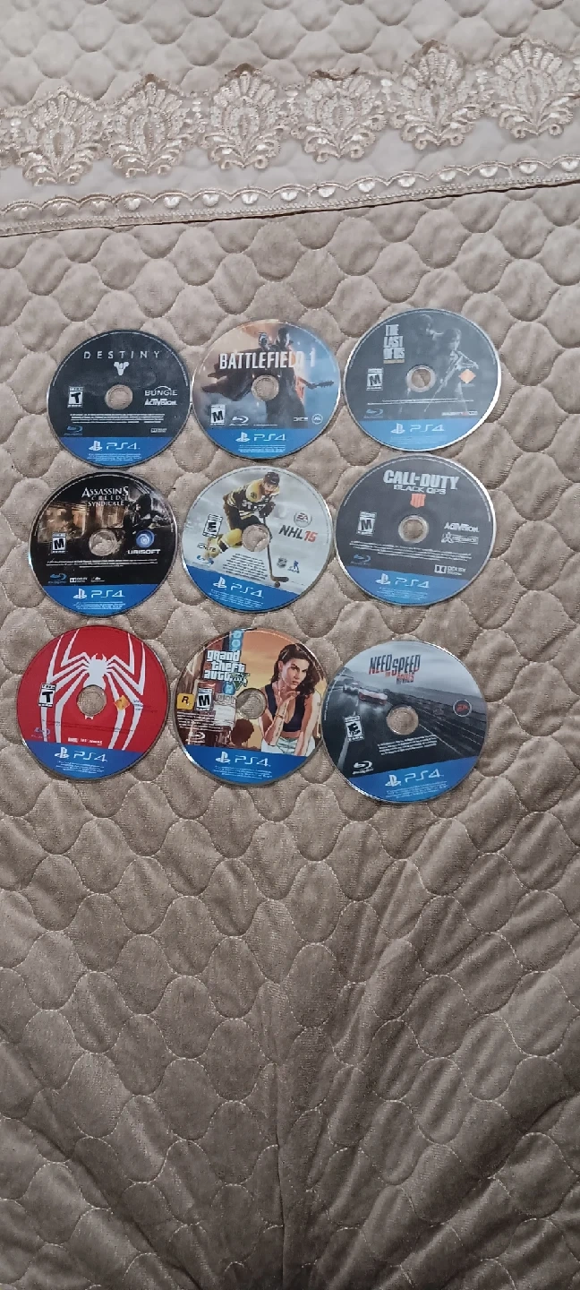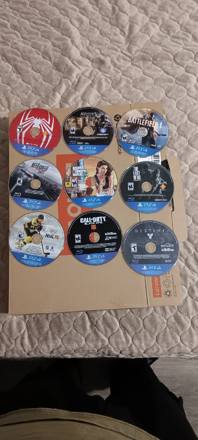 25Selling a collection of used PS4 games. Titles include: - Destiny :15$ - Battlefield 1 : 15$ - Call of Duty :15$ - Assassin's Creed :15$ - NHL 15 :15$ - The Last of Us :15$ - Spider-Man :20$ - Grand Theft Auto V :20$ - Need for Speed :15$ Great for expanding your game library!