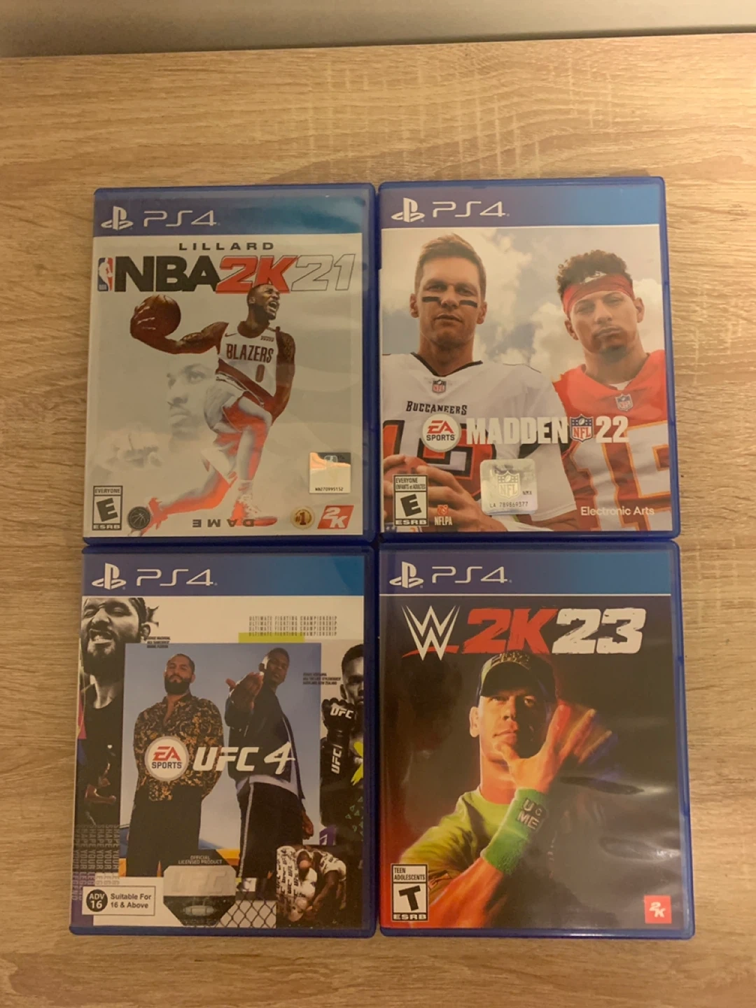 10Selling a bundle of PS4 games! Includes NBA 2K21 featuring Lillard, Madden 22 with Buccaneers players, UFC 4, and WWE 2K23. All games are in great condition and ready for a new player!