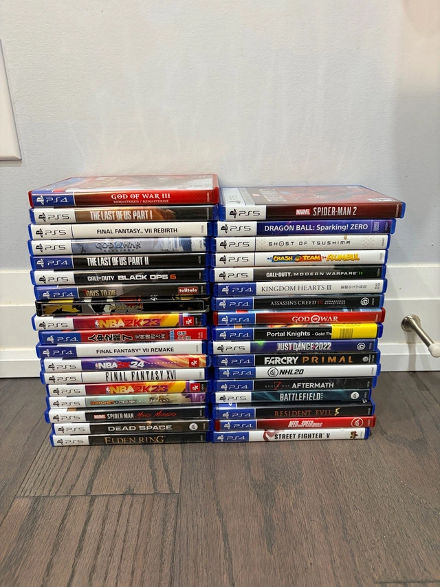 10PS4 and ps5 games for sale, see prices below. All prices are firm and pickup only. If it doesn’t say SOLD, it’s available. Don’t ask PS4 god of war 3 remastered-SOLD! Ps5 ghost of Tsushima-SOLD! Ps5 Spider-Man 2-SOLD! Ps5 The last of us part 1 SEALED NEW-$45 Ps5 dragon ball sparking zero-$50 PS5 Call of duty modern warfare 2-$40 PS4 street fighter 5-$25 PS4 assassins creed 3 remastered-SOLD! PS4 god of war-SOLD! PS5 Ratchet and clank rift apart-$45 Ps5 Spider-Man miles morales-$35 Ps5 dead space-$35 Ps5 Elden ring-$45 Ps5 Final fantasy 7 rebirth-$45 Ps5 god of war ragnarok-$45 PS4 The last of us part 2-$35 Ps5 Call of duty black ops 6-$60 PS4 7 days to die-SOLD! PS4 kingdom hearts 3-$20 PS4 Persona 5 royal steelbook limited edition-$70 Ps5 NBA 2k23-$20 Ps5 final fantasy 16-$35 PS4 yakuza like a dragon-$15 Final fantasy 7 remake-$45 Ps5 nba 2k24-$25 AEW wrestling fight forever disc-$20 Ps5 WW1 Tannenberg-$15 Ps5 assassins creed Valhalla disc-$20 Ps5 just dance 2022-SOLD! PS4 portal knights-SOLD! PS4 nhl 20-$15 PS4 far cry primal-SOLD! PS4 world war z aftermath-SOLD! Ps5 battlefield 2042-$25 PS4 resident evil 5-$30 PS4 need for speed-SOLD! Ps5 crash team rumble-SOLD!