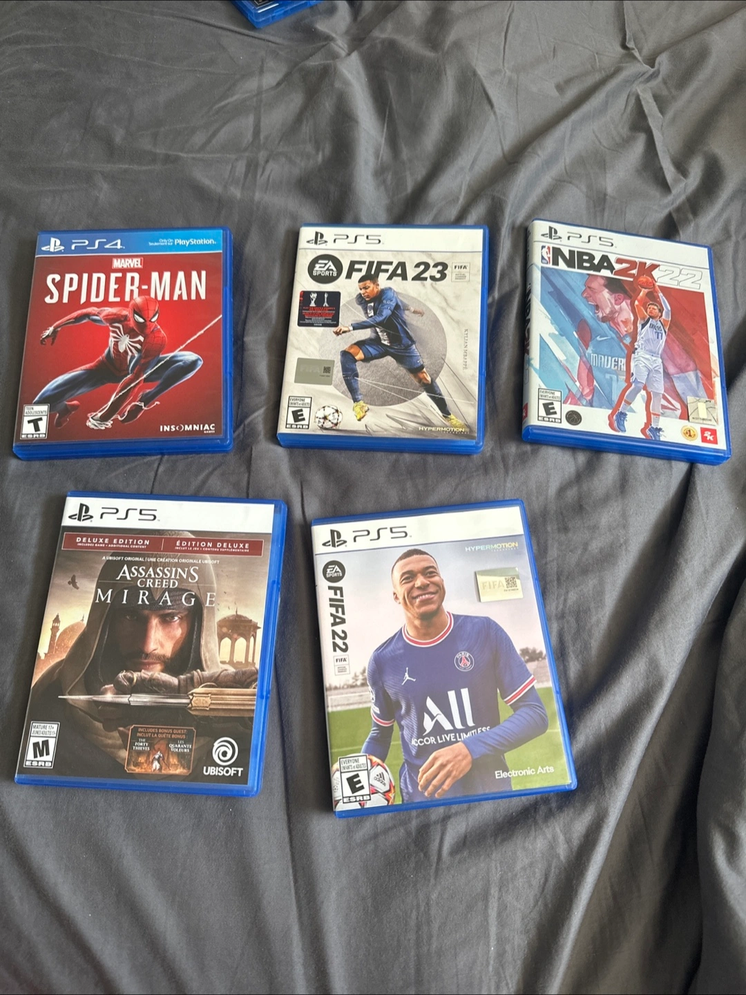 10Selling a collection of PlayStation games! Includes: - Marvel Spider-Man (PS4) - FIFA 23 (PS5) - NBA 2K22 (PS5) - Assassin's Creed Mirage Deluxe Edition (PS5) - FIFA 22 (PS5) You can either buy all the games for 50$ or but each individual for 20$ All games are in great condition and ready for a new home