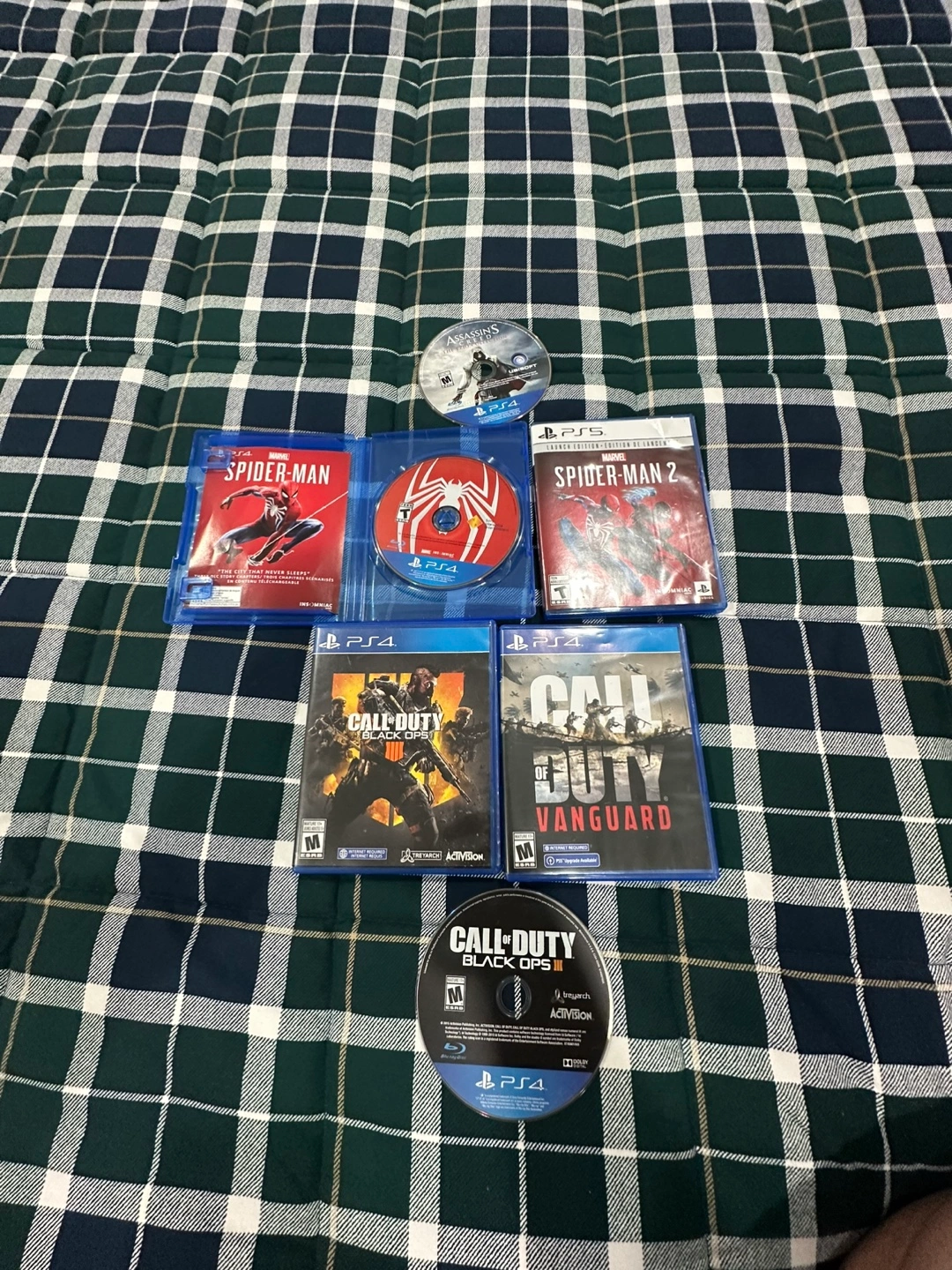 10Includes Marvel's Spider-Man, Marvel's Spider-Man 2, Call of Duty Black Ops, and Call of Duty Vanguard. All games are in cases with discs. Assassin's Creed disc included.