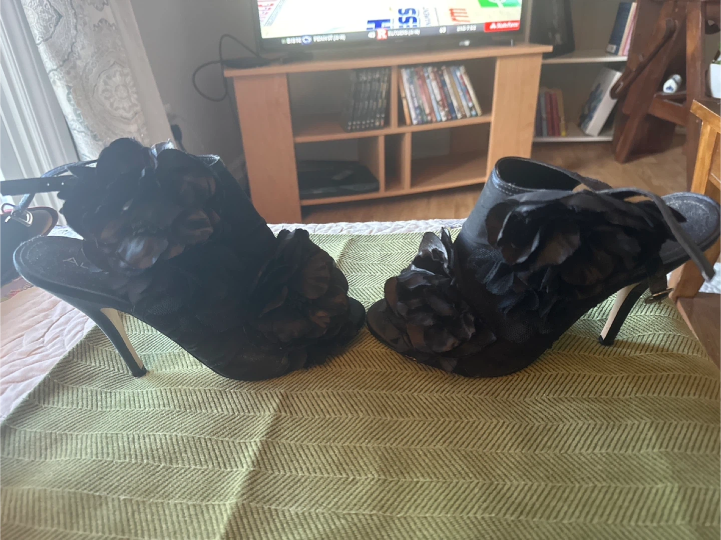 These are stylish black ALDO high heel sandals. They feature decorative floral embellishments and an ankle strap for a secure fit. size 9/40. Perfect for dressing up an outfit for a special occasion!