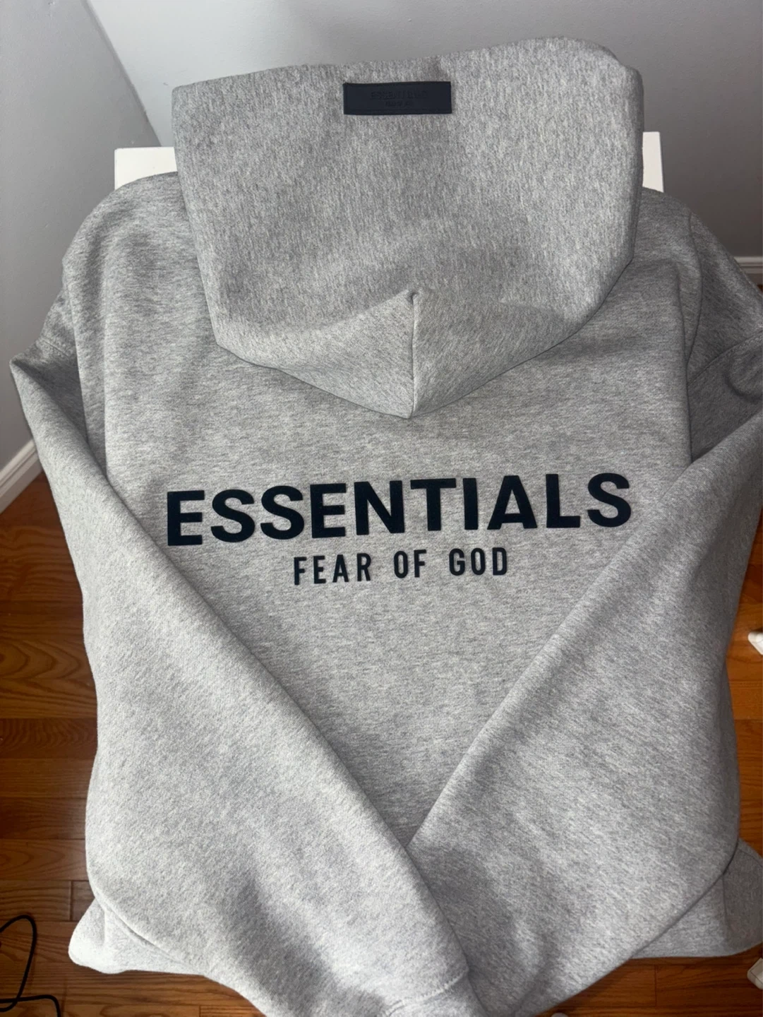This is a grey Essentials hoodie by Fear of God. It's a comfortable and stylish hooded sweatshirt. Features a large ESSENTIALS Fear of God graphic on the back. Made from soft fabric.