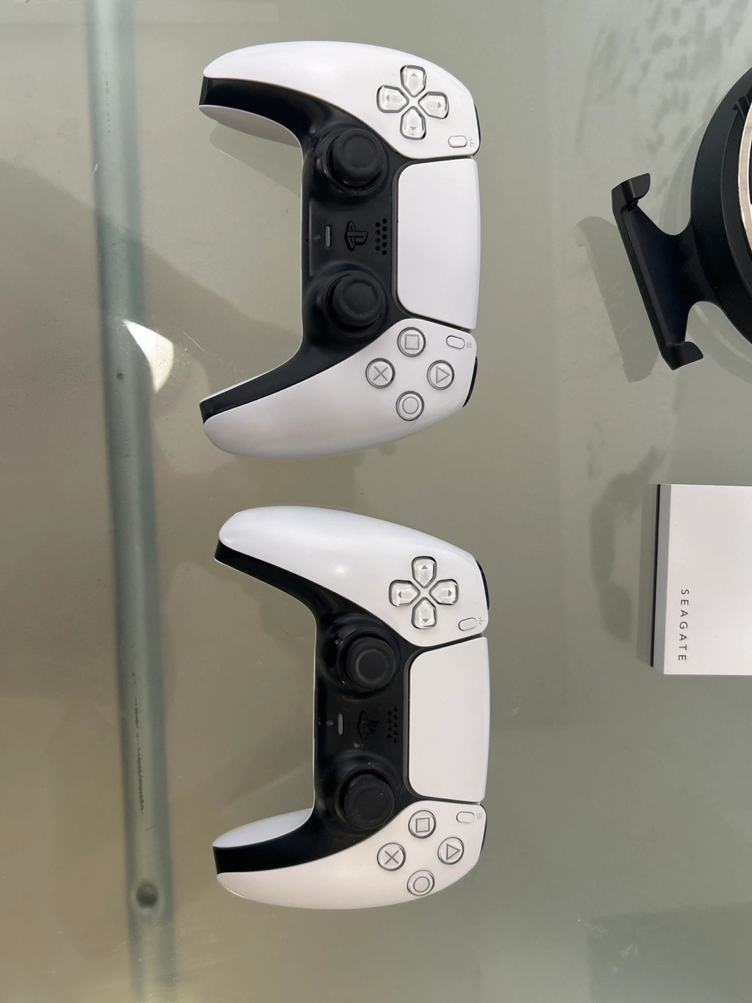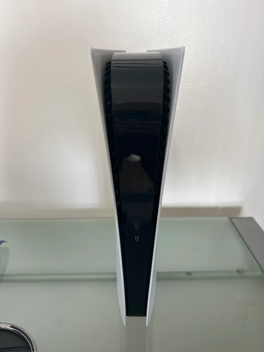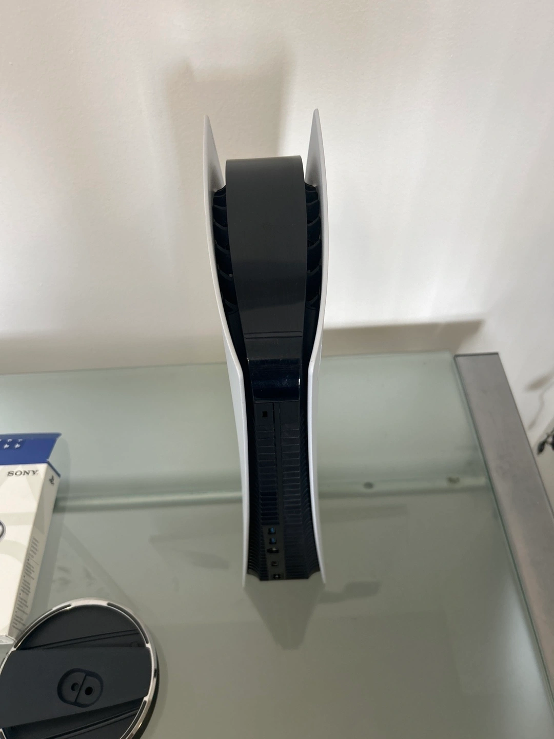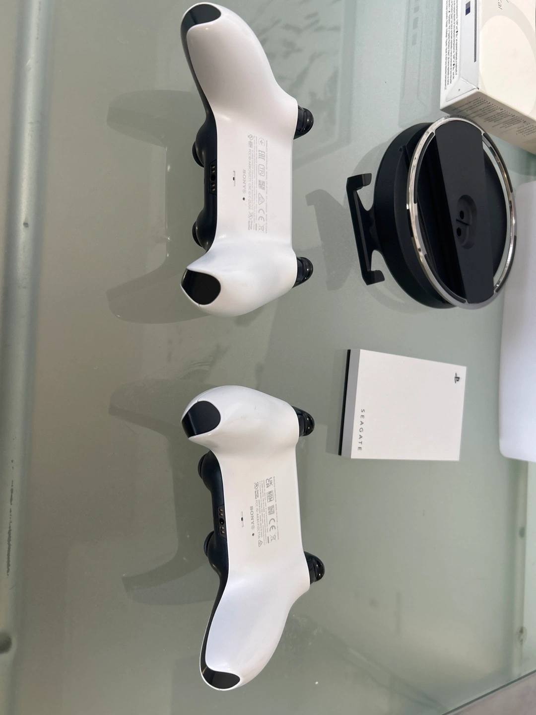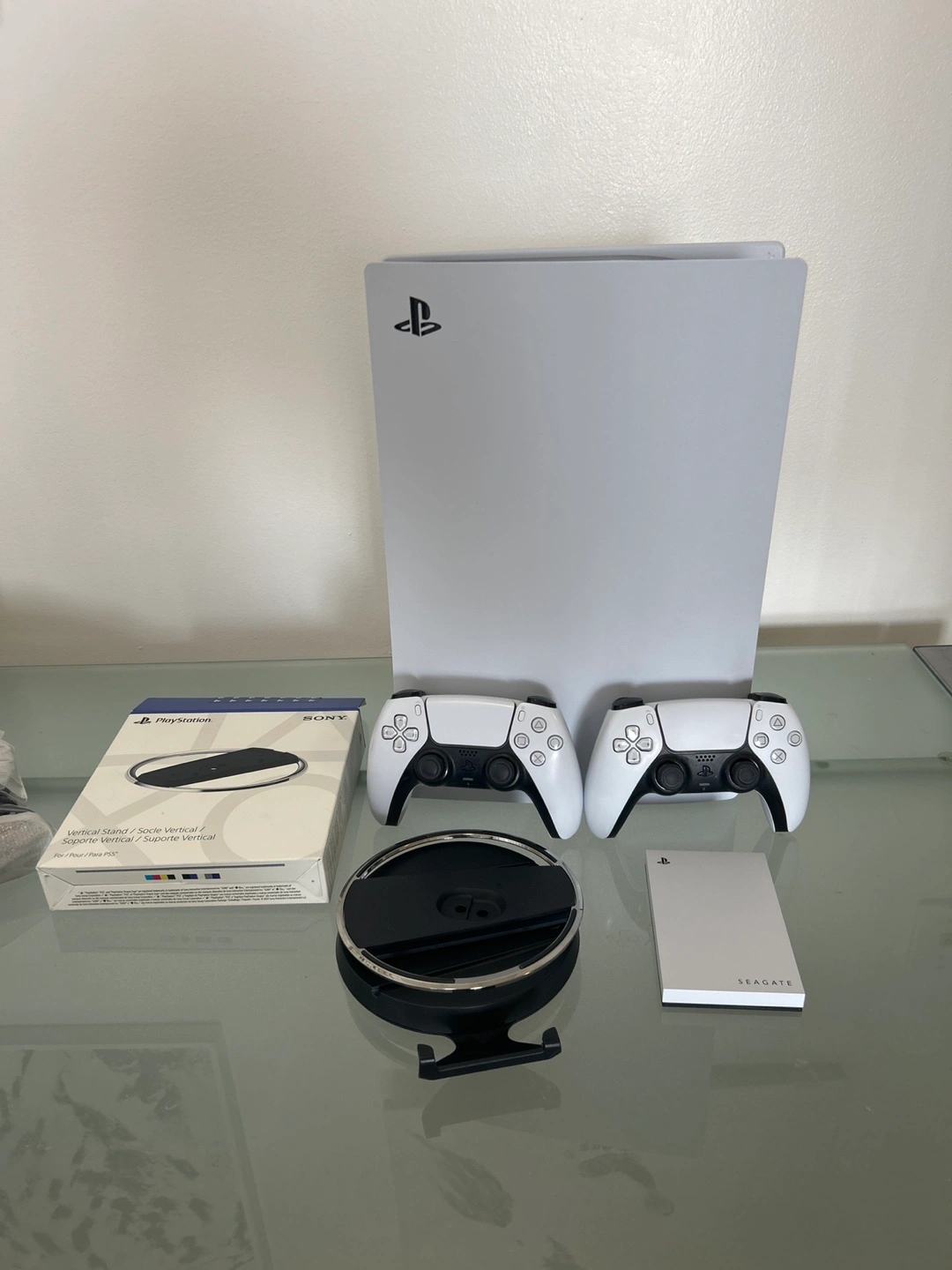 PlayStation 5 console, two white DualSense controllers, and official vertical stand. Includes 2 TB Seagate storage expansion card and all cords. Perfect working condition.